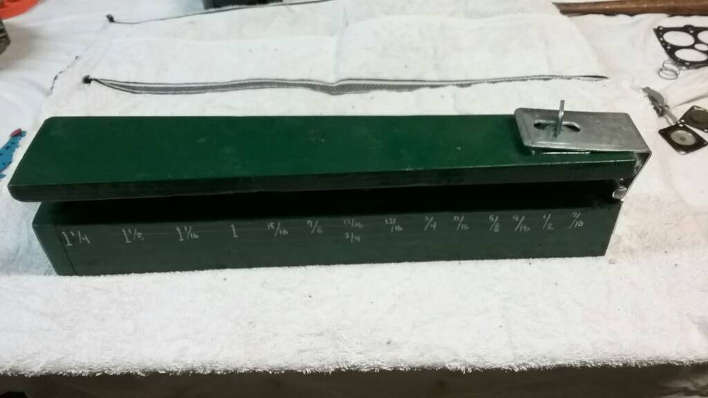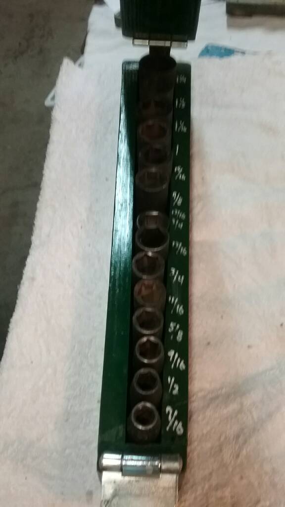I lined up sockets in a row on 3/4" board, drew a straight line & cut for bottom and top. Then 3/4" around sides, top is hinged at back, front a strap hinge bent. Turn the lock part holds it. Painted, then white marker sizes. It's easy to carry.