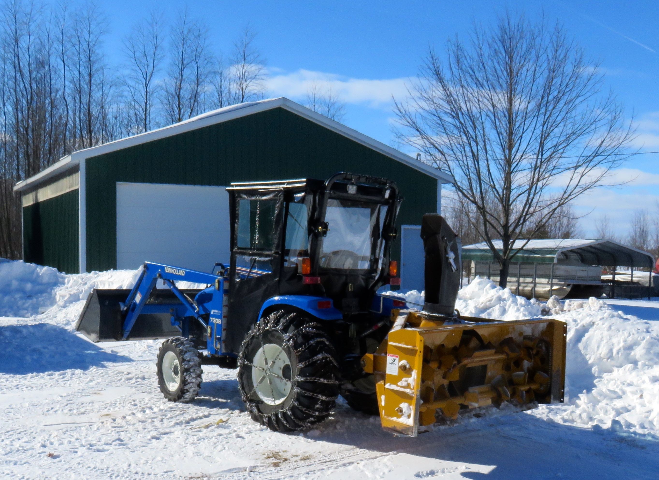 Here's a couple pics of an OTC cab I purchased from NH this year for my TC33D - I think your TC30 may take a different model cab. OTC was willing to sell direct to me but it would have cost an additional $100 for shipping - if you buy it from NH shipping is free to their dealer. It cost nearly $1600 with tax which seems a bit pricy but it appears well made and was a good fit with no drilling or other mods to the tractor. Glass windshield and manual wiper were standard. It went on easy with only myself and I plan to take it off in the spring and put it back on in the fall. I have 2 gripes - the mounting brackets for the top need to be a little more adjustable and I'll deal with that in the spring - also some of the attachment points use tie on ribbons in places that are difficult to get to - I'll probably go to tie wraps next fall. It's not air tight but is a huge improvement not sitting out in the wind. If a strong wind blows snow from the blower back on the cab some will find it's way in but not enough to cause a problem. I think a rearview mirror - possibly inside the cab - would be handy. I wish I would have gotten the cab 13 years ago when I bought the tractor.