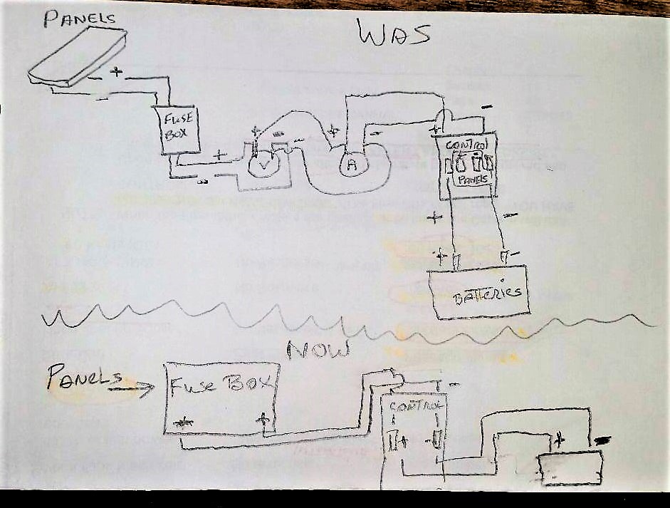 Anyway, I would like to replace the V and Amp meter with good ones and properly wire the AMP meter. One more question about APMS "IN" IF a bright day and the batteries are low the controller allows up to 18V then pulses every 45 seconds or so. I guess that is fairly high Amperage.... When the batteries are well charged and/or scattered clouds it only has about 13Volts. Again, I've never had a problem before. Weird. Thanks for all the input.
