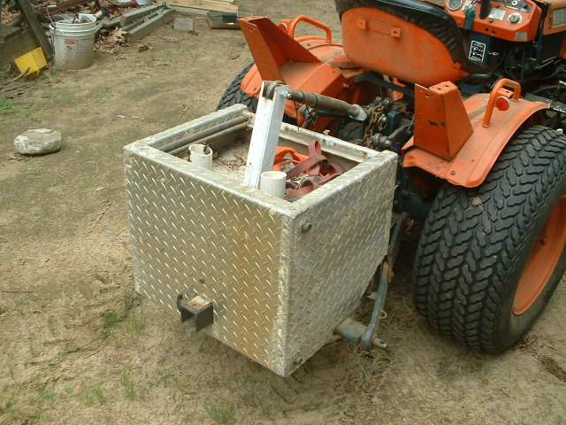 Here's a couple pictures of some add-ons I made this spring. The forks need a bit more work but they handle the limit of my little tractor. Most of the parts are from an old weight lifting bench, you can see the receiver for the forks will also accept a 2" hitch and they can slide side to side. The bench had quick release sprung pins which I used for ease of removing forks/draw bar. The way I built the frame allowed for vertical tubes for safety but I have yet to cut any which is why I stuck the "t" one just to show it. The other pic is of my weight box. This was a truck box that I cut down to fit my tractor and loaded with cement. Again I have one of the weight bench quick releases so I can add a hitch easily. The white tubes allow me to shove a rake or shovel plus there's space on top for straps etc. All in all I'm pleased with both setups. Having a set of forks is a huge plus.