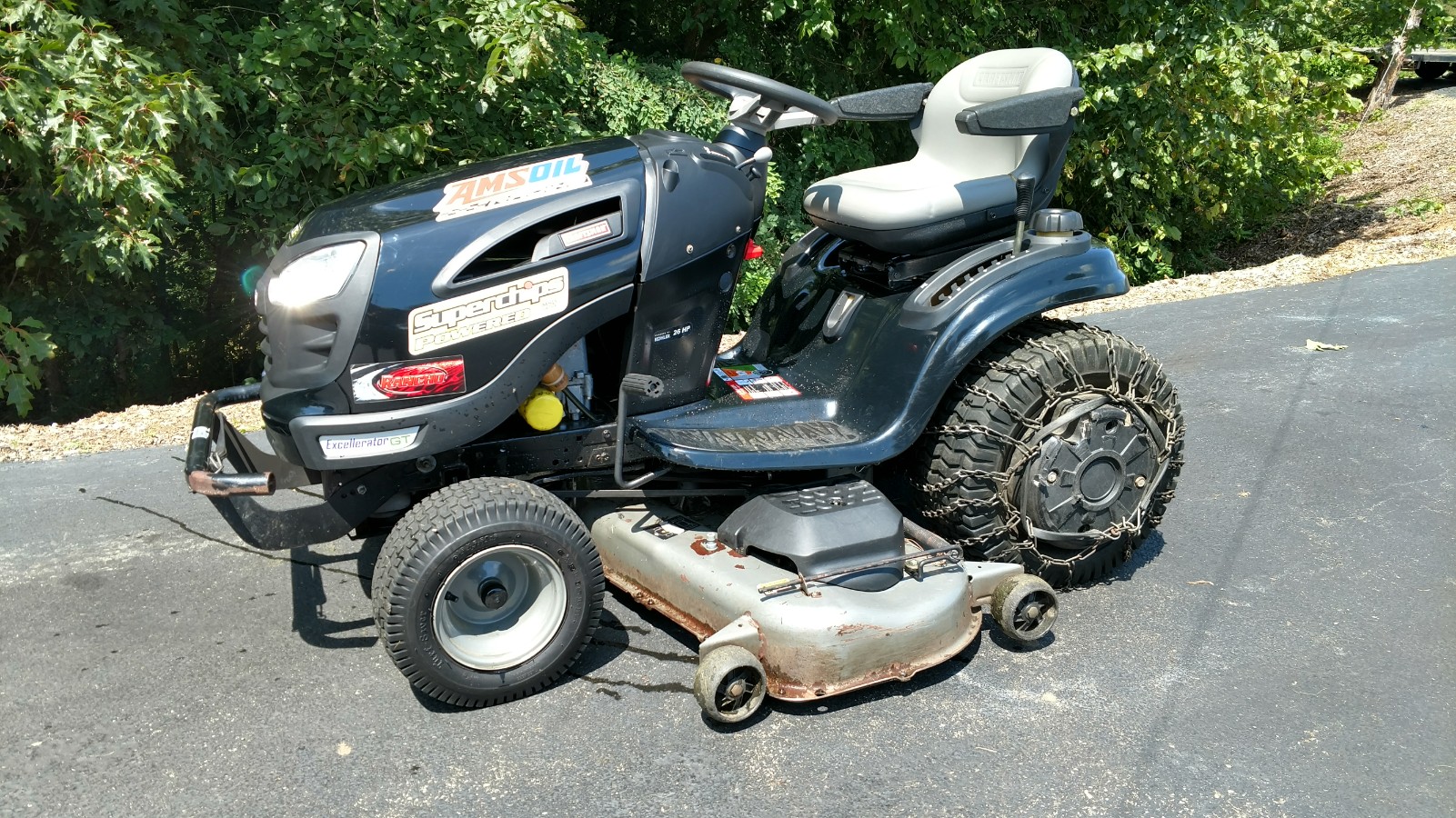 2010 Sears Excellerator GT - Arguably the biggest, baddest, and bestest tractor ever to set in a Sears store. This Husky built garden tractor is truly a beast, with a Hydro Gear 730 rear axle and 26 HP Kohler Courage, it has never ending power. But the engine is a Courage (not a contractor grade, rated EPA class C for 500 hours median engine life) and after 7 summers the transaxle is starting to give it up. Where this thing used to crush the hills at speed (8.5 MPH max speed, and it was close even up hills at first!) the transaxle is giving up a good bit of its power now when going up.