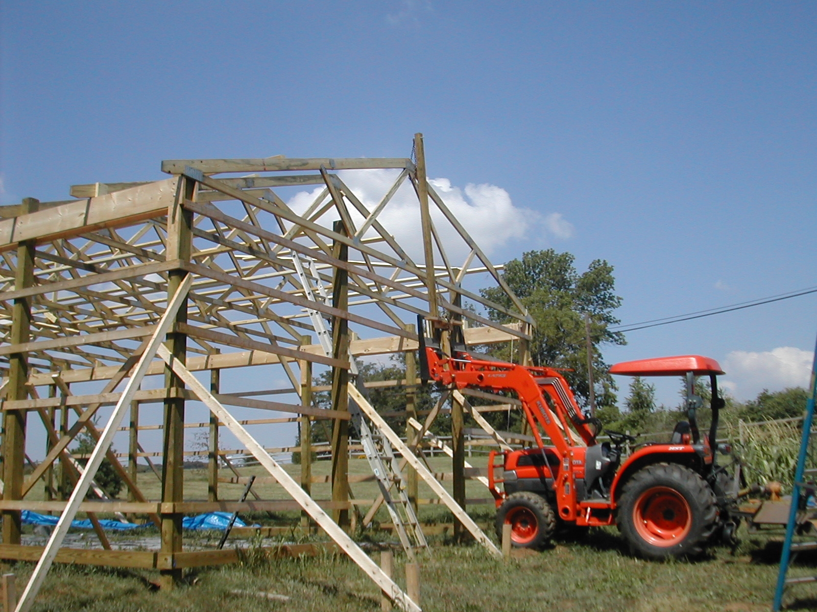 The first picture is what the inside looked like when we moved into it. We still had the trim around the windows and baseboards to do and something for a floor covering. The second shows us setting the trusses. They are 24' clear span and the heaviest weighed about 170#. Normally, one would start with the truss upside down and put one end on the top plate then the other end on the opposite wall, then rotate it upright. It was to heavy and the wall to tall for us to do that. Also note: That tractor is rated for 3000# at the pins, but with that 20' extension, 200# is about all I'd attempt to lift with it. If you do this, be sure to go very very slowly. A one inch movement at the pins is about 20" out at the end of the boom.