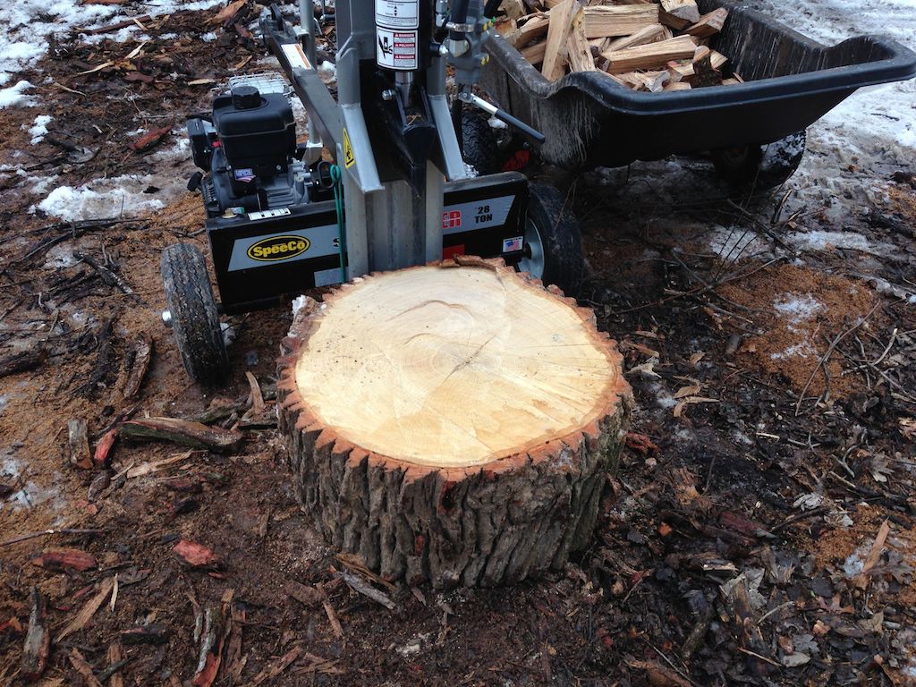 Edit: Here it is about to split a pretty big round. My brother counted 140 rings. These were *very* hard to get to the splitter, without vertical operation it would have been impossible to deal with them.