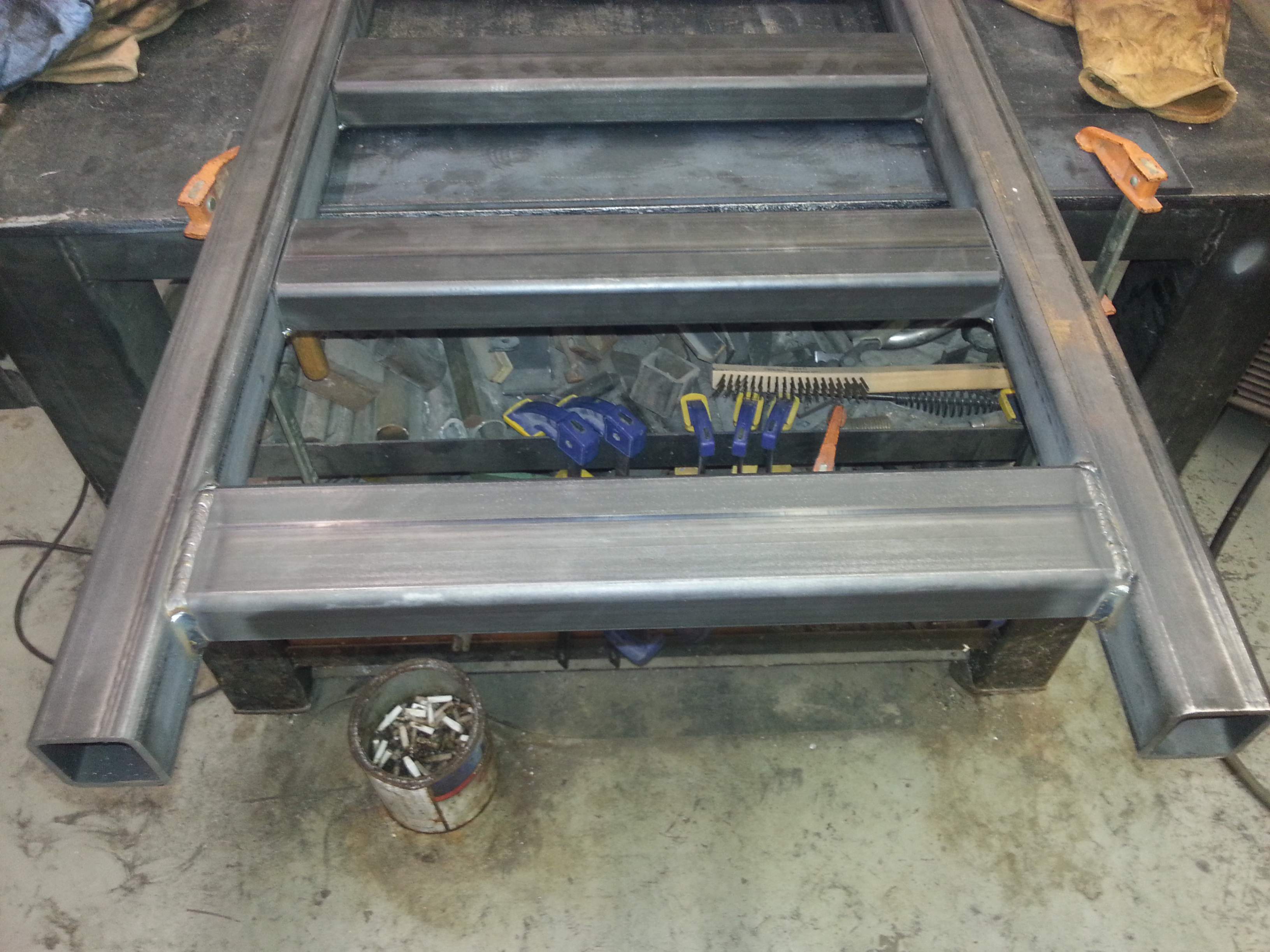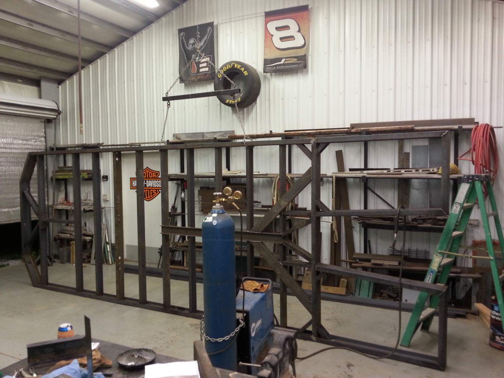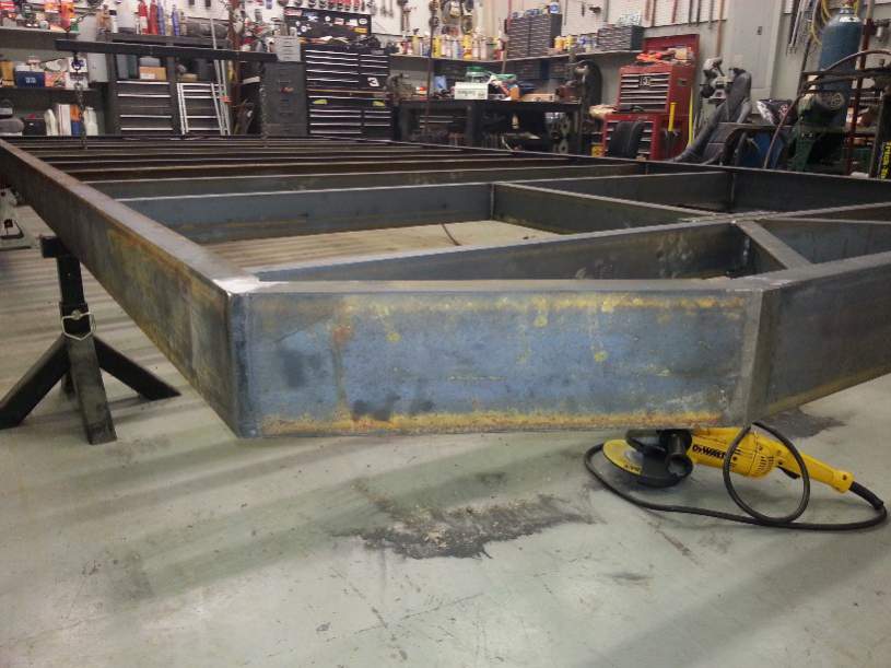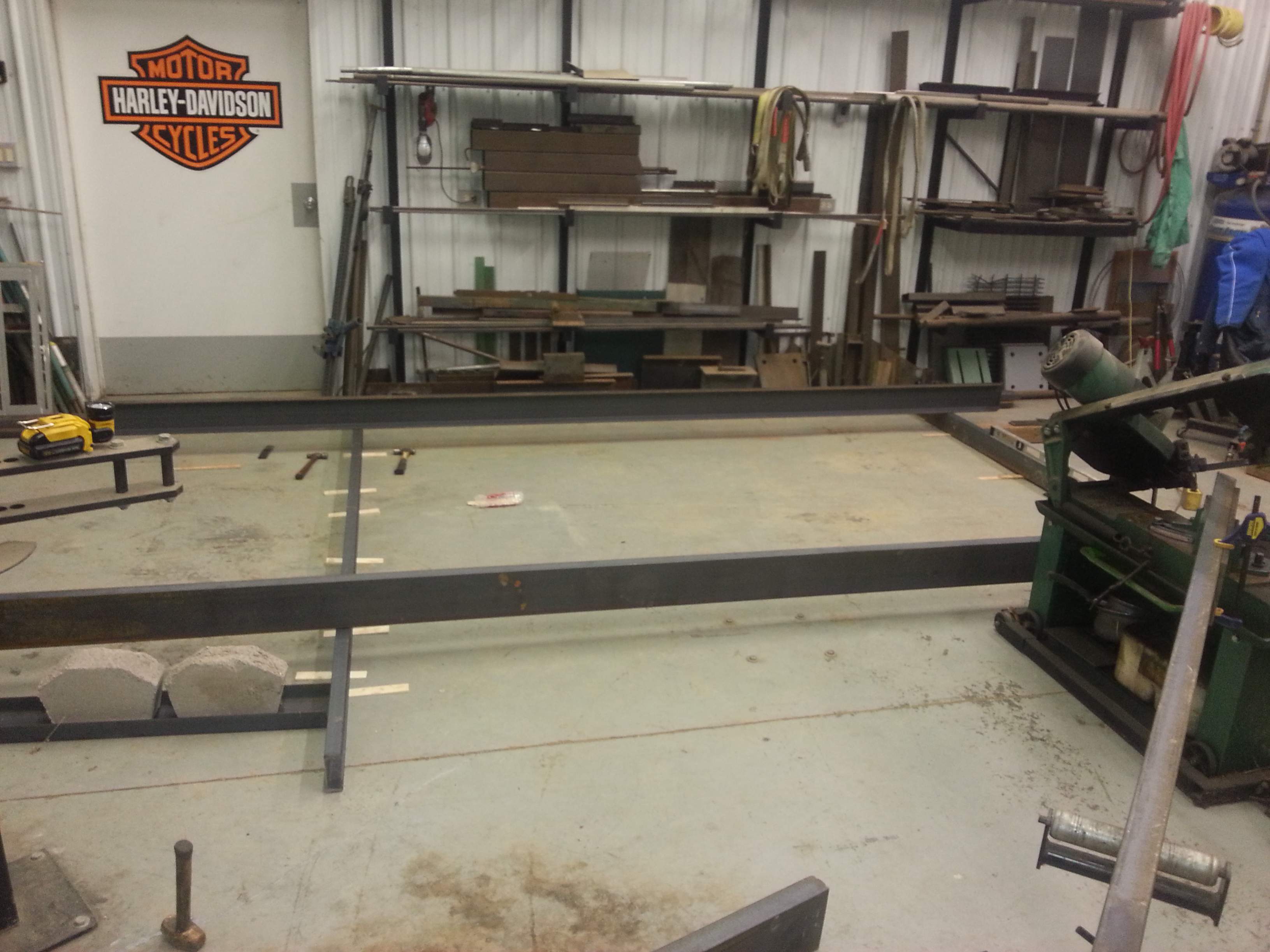 It probably would have been cheaper to just buy one, but after looking at what's out there for sale, I decided to build my own the way I wanted it. I got some basic ideas from a lot of different brands of trailers and pretty-much made up the design of mine from them. I used 6" channel for the main frame and 4" channel for the cross braces, I want it heavy duty. The deck is going to be 20 feet long and 83" wide, that's about as wide as I can fit in my shop. I also want inboard captive ramps (so they will stay put) and I hate to lug big heavy ramps around, some type of receiver on the front for a winch, recessed swivel D-ring tie downs, solid steel deck, 5200lb axles with brakes on both, recessed running lights wherever possible, custom tail lights, a receiver hitch on the back for various attachments and a few other things i'm sure. I started by making the floor perfectly level, then started cutting metal.