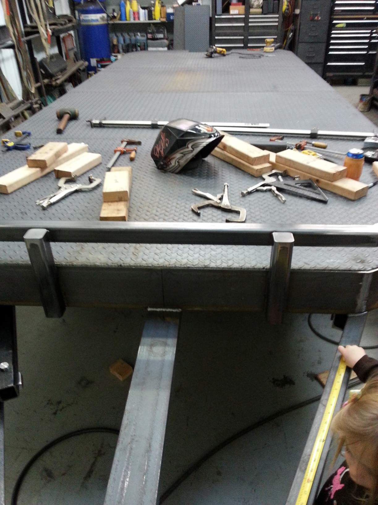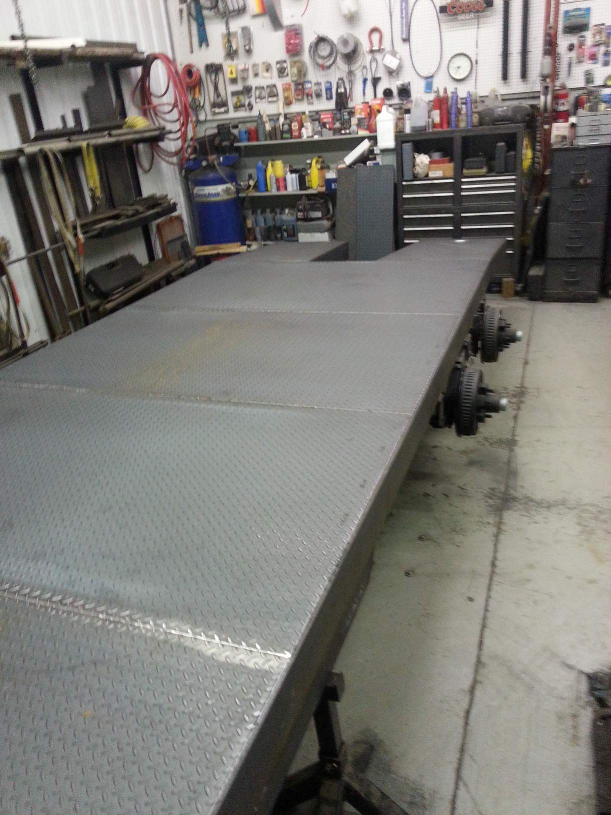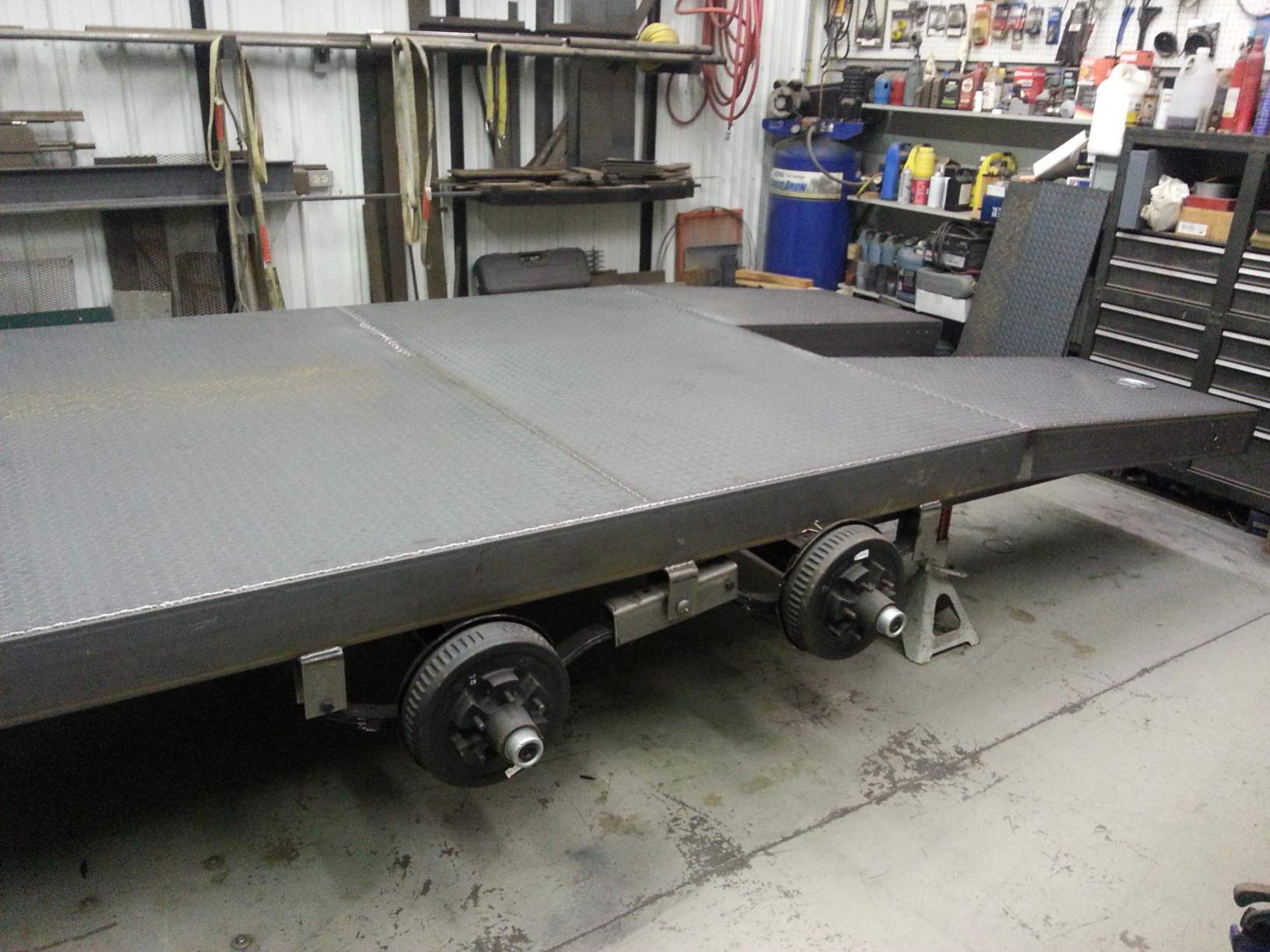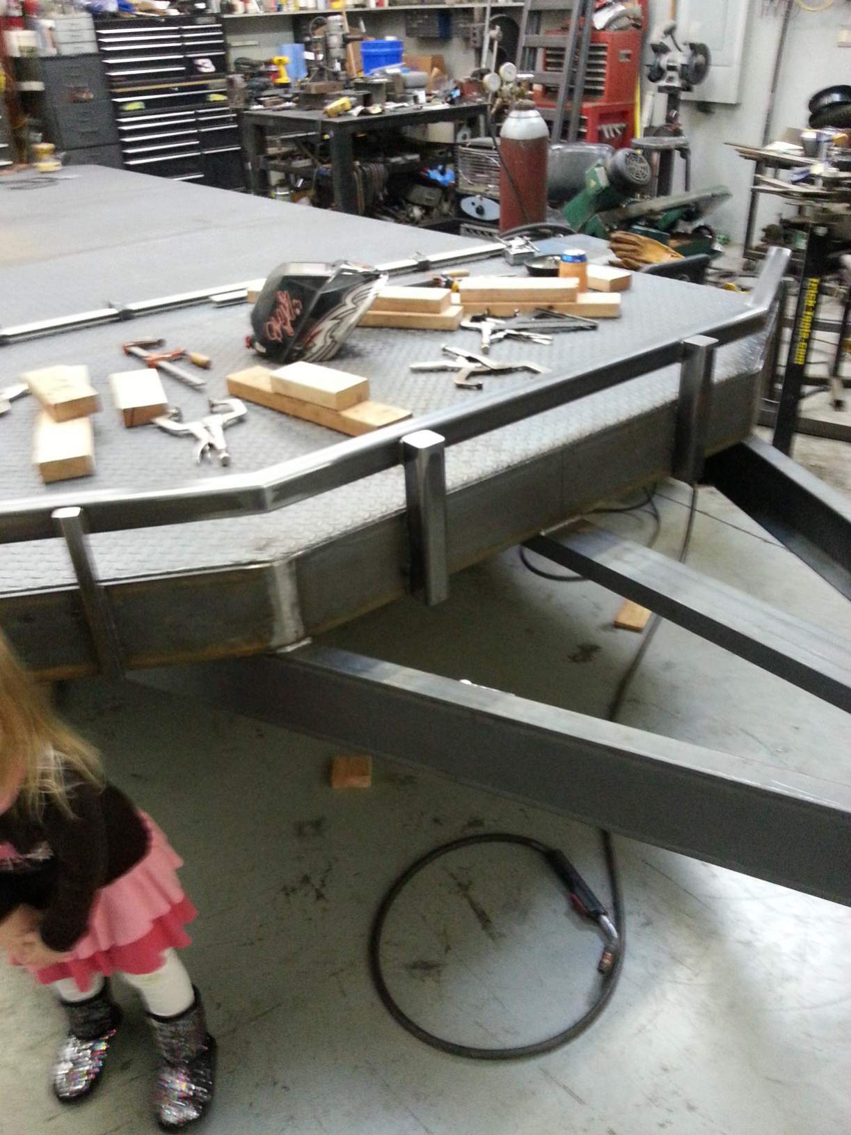 Trailer is skinned. I used 14 gauge diamond plate for the decking. I used five 4x8 sheets. The cuts were made with both a cut-off wheel and my jigsaw. I used a whole tank of shielding gas welding the plate on. I used 1/2" metal for spacers on the cross members to level the plate to the outside frame.