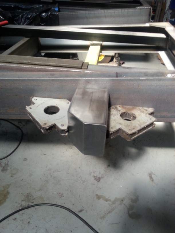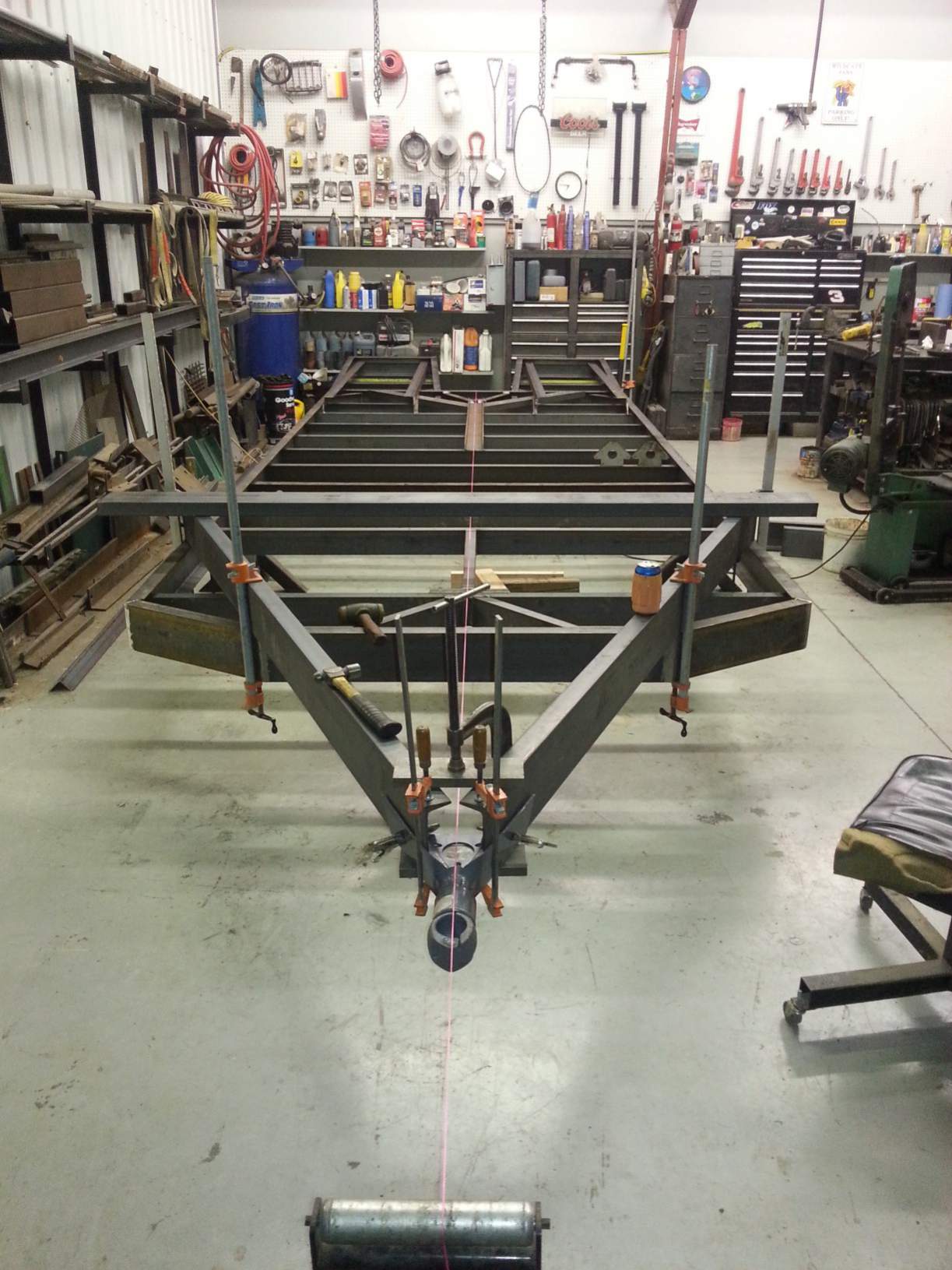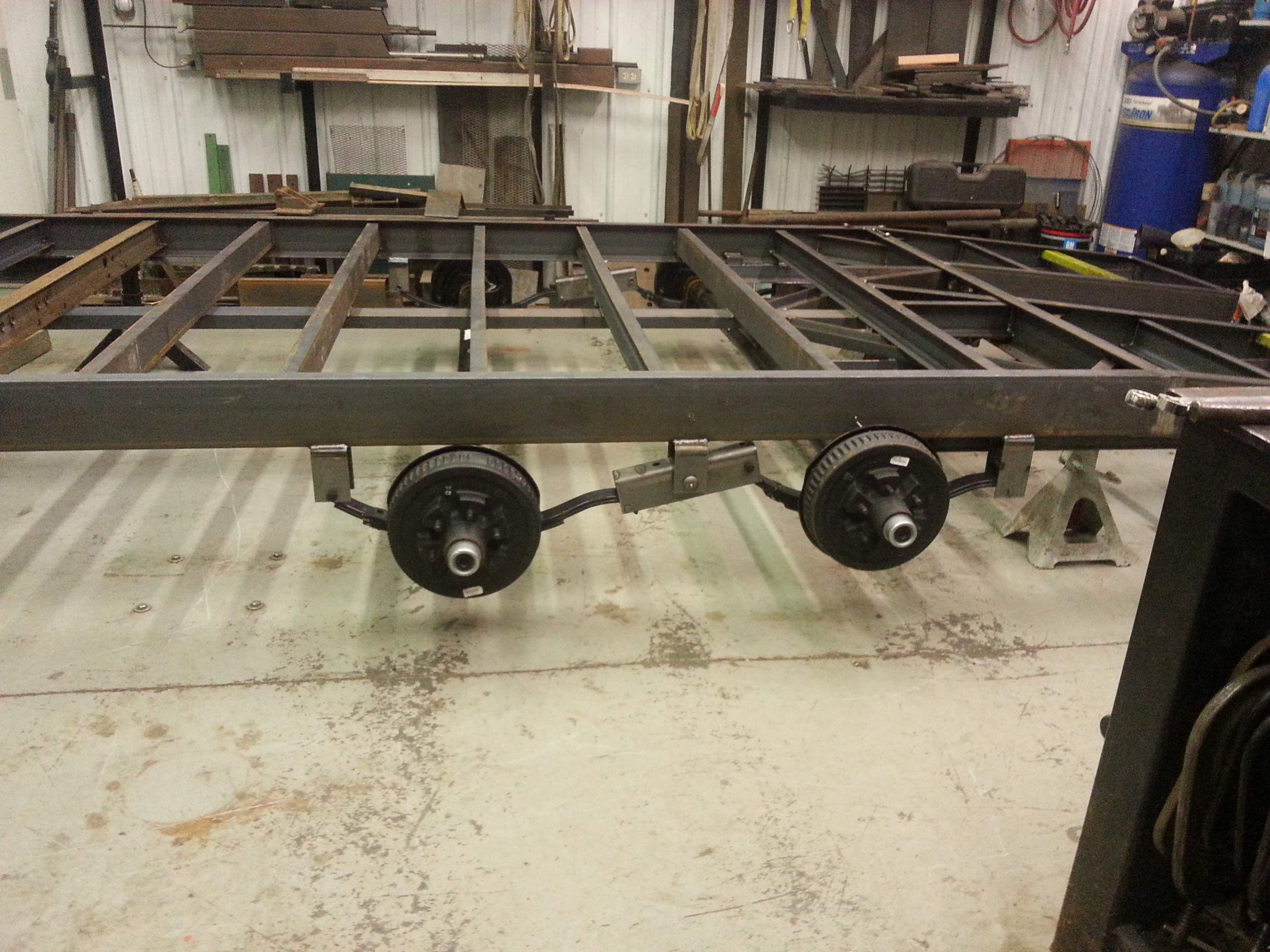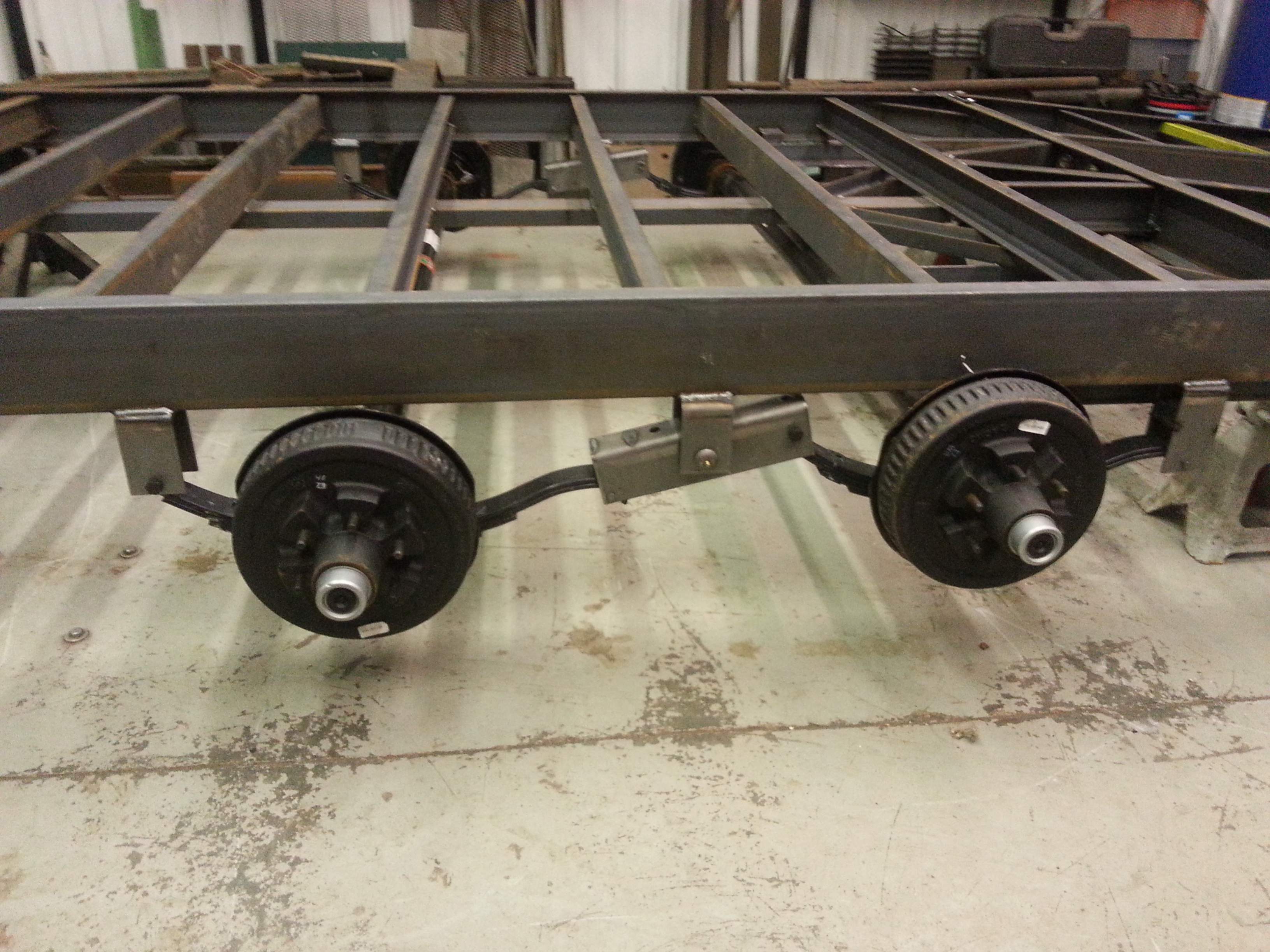 I measured and ordered two straight 5200lb axles (with brakes on both) from a local trailer dealer, when they came in they were 6000lb, he let me have them for the same price. I welded the hangers on with the trailer upside down then flipped it over and bolted on the axles.