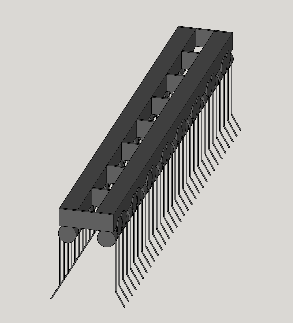 I made a not-to-anything mock up. Basically I want to duplicate the bar holding the springs with a gap in-between to access the bolts and to prevent the springs from getting entwined (which happened 4 times in a day of raking). This way I have full tines going in both directions. Any thoughts?