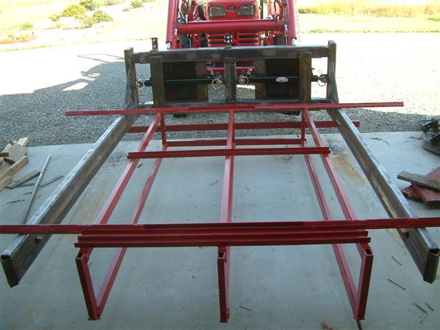 The photos were taken during the final steps of construction and the four brackets that attach the accumulator fence assembly to the squeeze arms still had to be welded on. You round up the bales in groups of eight with the accumulator attached to the squeeze. When finished with that step, the accumulator is detached and the squeeze is used to move the bale groups to the flatbed trailers .