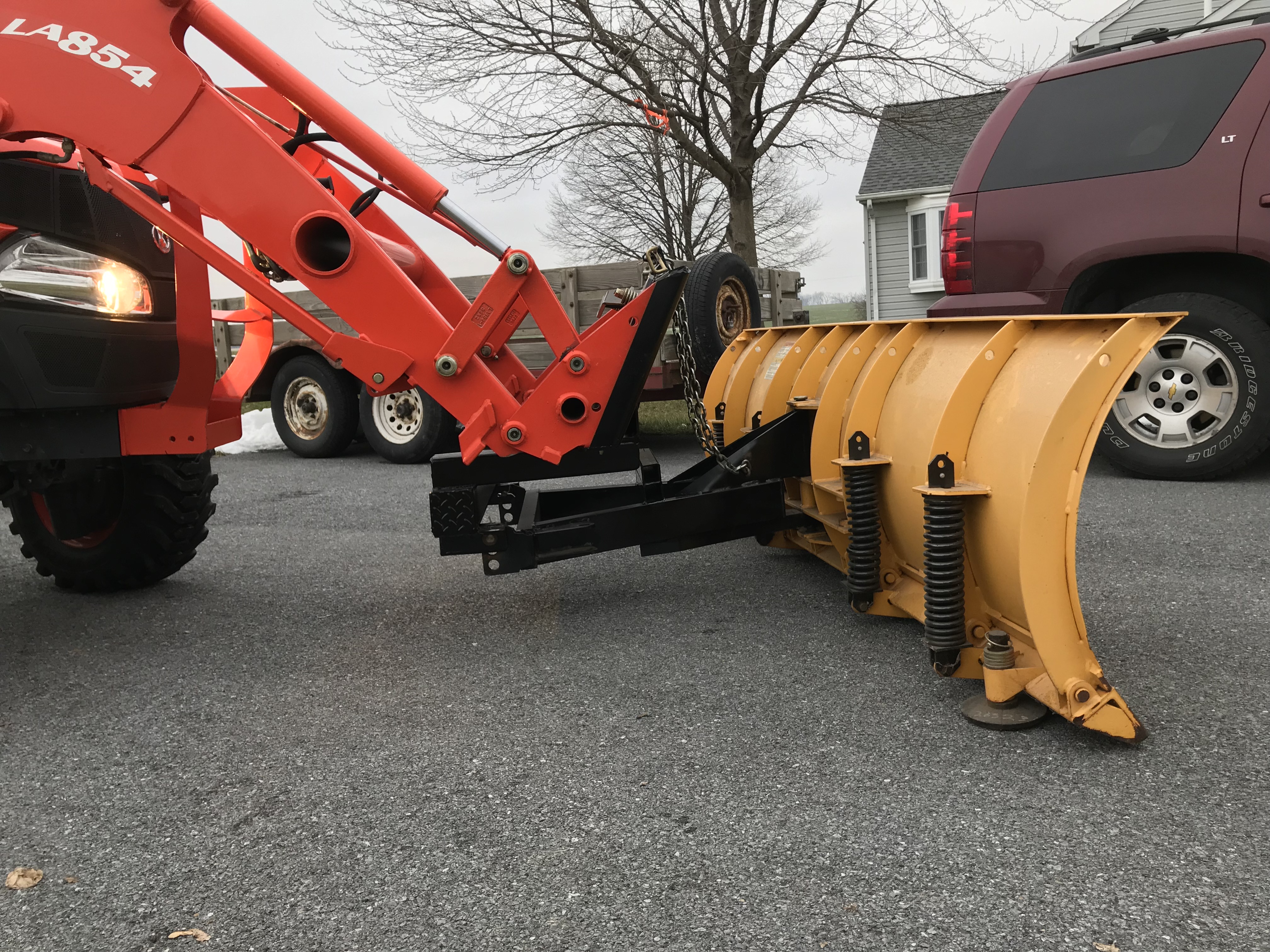 The parts I used are from a "spare" 8 foot Fisher plow we had at work. It'll be interesting to see how the L4240 will handle it. Looks like a lot of blade after seeing it all together. The plow was loaded onto a utility trailer at work yesterday (paint still wet) with a telehandler that was handy. On the way home I figured it would be easy to grab a chain and take it off with the L4240's FEL. Then it dawned on me to just drop the loader bucket and snatch it with the SSQA tabs. Worked fine.