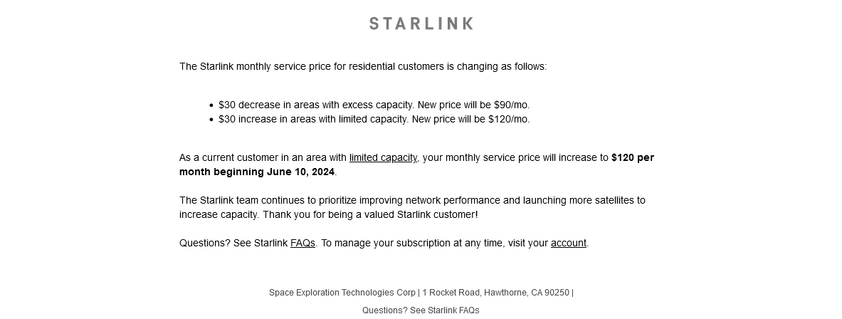 I got the price increase e-mail. I find it highly unlikely the capacity in my area changed. I'm pretty rural with residences spread out quite a bit. I've never seen another SL on anyone's roof out here. Curious if anyone gets that e-mail and their price goes down?