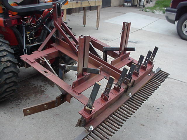 The back rake is 60 inches and made with r+r spikes and the gap between them is about one inch. I got the idea when someone on here was talking about using spikes for a tooth bar. I bought about $40 of new metal (20foot of 1/2 by 1 1/2 bar) the rest is all scrap metal I buy for 25 cents a pound. I'm not sure how much it cost to build but I do know it was under $200. It will be more if I ad wheels to it.