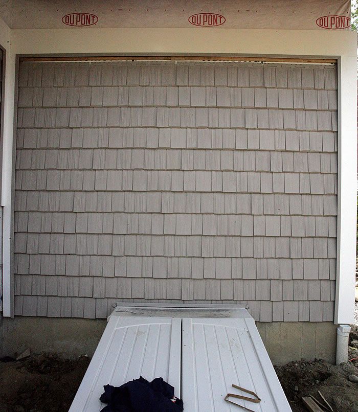 We are expecting storms tonight and I am hoping he exposed fiberglass insulation in the garage does not get ruined by blowing rain through the open garage doors. These walls are getting OSB - not sheetrock, to be installed by the trim carpenter.