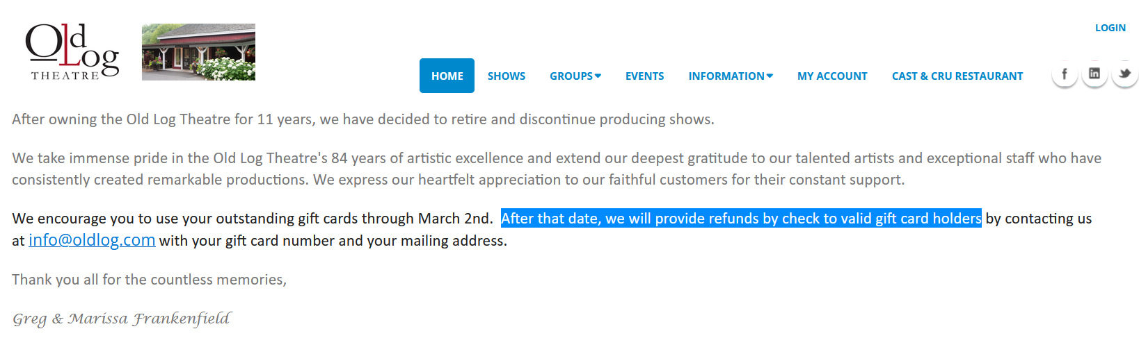 Here is an example of operating a business with honor and integrity. They are paying refunds on gift cards after the business closes!