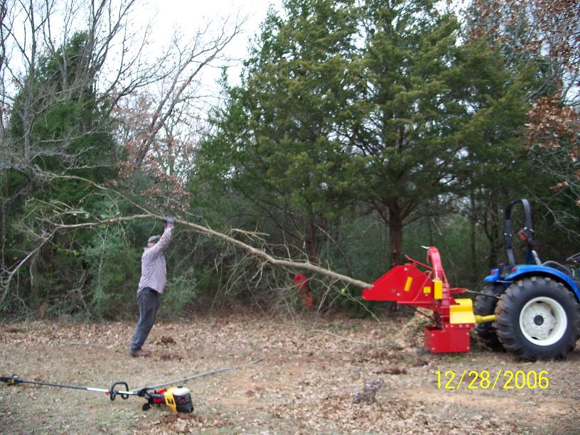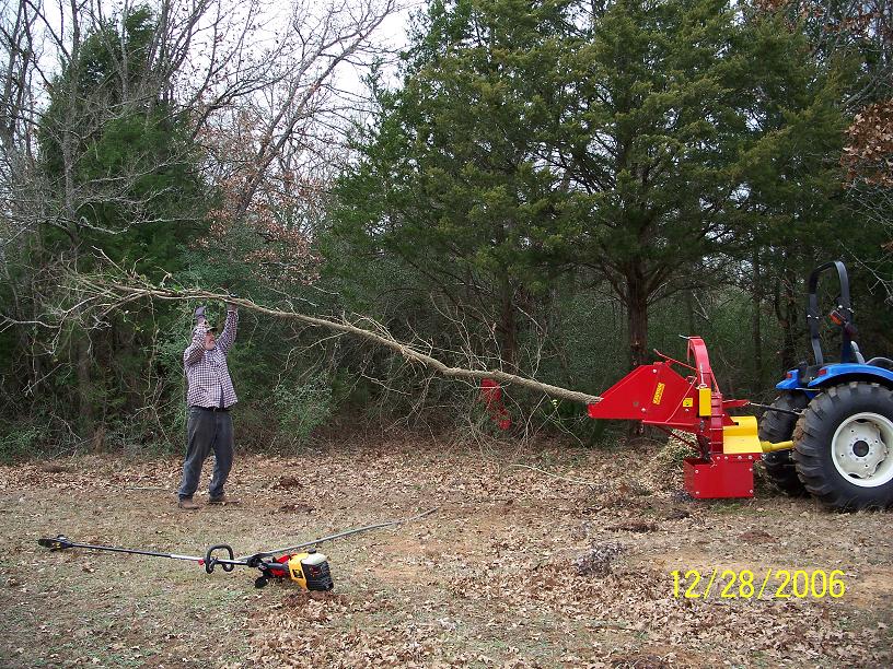 Using it was another matter. We chipped yards and yards of all the above mentioned trees and lots of yupon too. It makes chips much smaller than I expected. Cedar would chip into 1/4" squares. It all should compost well. It would stutter my tractor on the 4-5" elms and 5-6" oaks, but went through everything else like butter. I also thing I was at a couple of hundred rpm's lower that PTO speed. I was impressed with what the chipper could do. I would post pics but the site says they are too big. Anyone know how to resize them? I also reversed the discharge chute to keep it from shooting across the chipper. It piles them right where I want them.