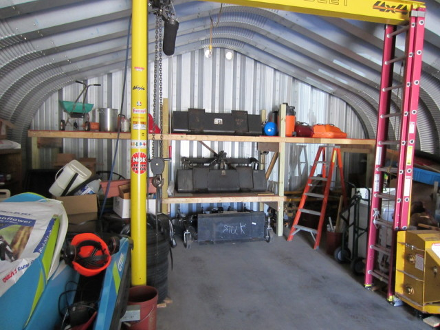 In the winter I would keep the plow blade and blower on the ground on a pallet (whichever is not on the tractor). The rest of the year I would keep the bucket, forks unstrapped and on a bottom shelf/floor level and put the snow stuff up high.