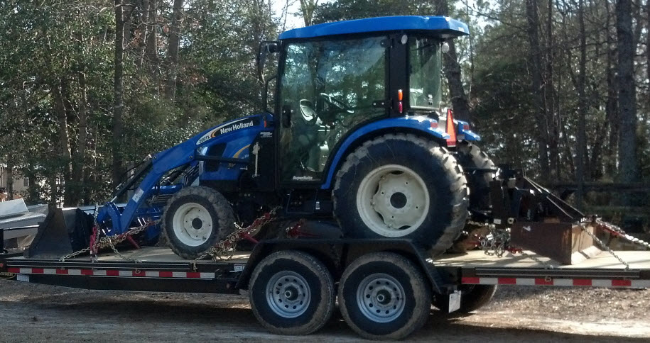 If your tractor has a parking brake apply the brake after you get the tractor positioned on the trailer. You'd be surprised at how much a tractor can rock forward and back regardless of the transmission type. You'll save yourself multiple retightening of the tie downs on a long trip.