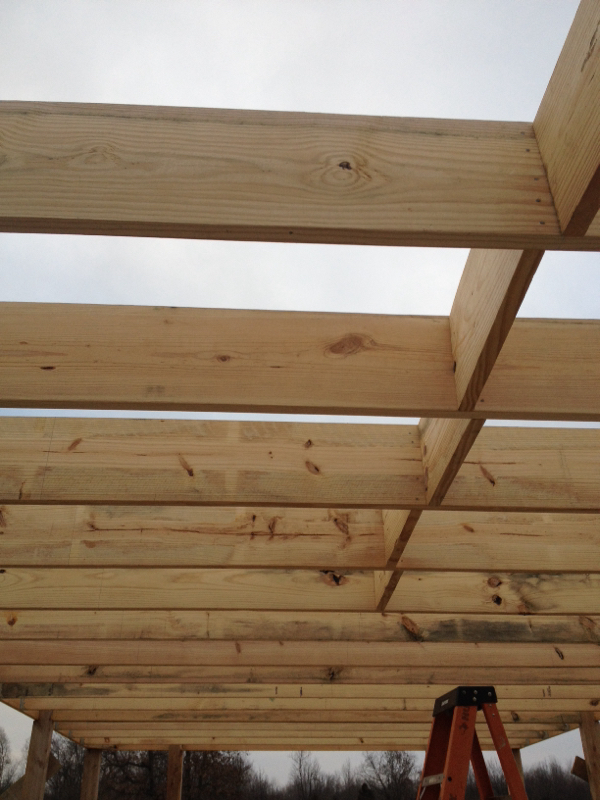 Got started putting up the floor joists. I was surprised by how much this thing has moved over the winter. We are having to pull and spread just to get things straight. The joist are up at the post. Going to try to finish them tomorrow. Maybe they will go up faster.