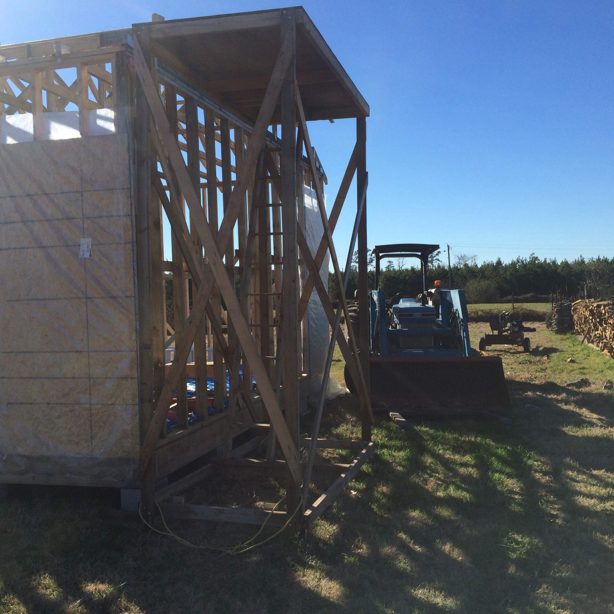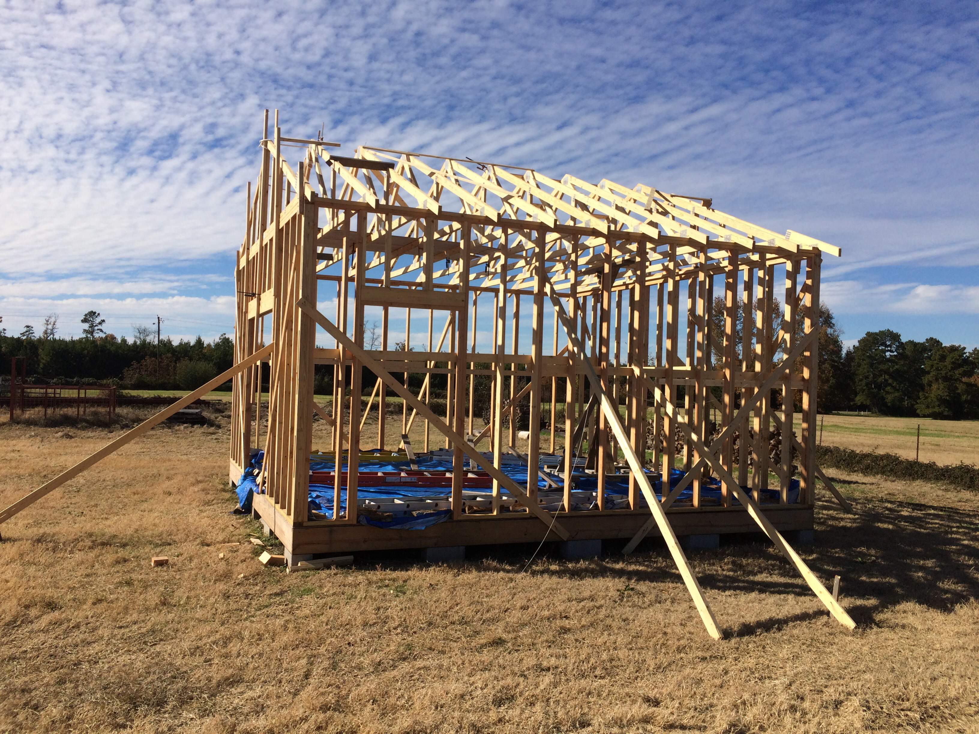 Farmer, like you, the holidays n weather has kept me off my building. By Thanksgiving, I manged to get the walls up, put in some 4x8 corner bracing and get the trusses up. And there the project stayed until yesterday. I started again. All my rain has caused a little mildew to build so I am spraying as I go to kill it. I installed the ladder framing for the front overhang, just a 12" overhang. I need to do the back then add the 2x4 pieces and I will be ready for the plywood roof. Working alone is slow but slowly moving on.