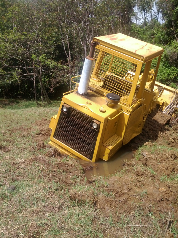 I have a neighbor that bought a used dozer a couple months ago. It is a Cat, but built for the navy, single ram 4 way on front. Forget the number, but neighbor says it is about size of a D7. It is tall! He hired a couple of experienced guys to do some clearing with it while he was on the mainland for business. For reasons unknown these guys take the dozer toward one of the streams on the property. Oh, Btw, this is still rainy season. So these guys get the dozer stuck and have to abandon it about 2 weeks ago. This past weekend my neighbor invited a few of us over for a look-see, hoping we might come up with a plan. This dozer is sitting at the bottom of a fairly steep, muddy hill. Dozer sits at an angle with the right rear track submerged in muck upto to bottom of the engine compartment. Did I mention there standing water in the muddy footsteps? The largest tree within sight might be 3 inches. The hill across the stream to front of dozer is even steeper. To be honest, I refused to take my Ck30 with backhoe down to help dig him out because I KNOW Id get it stuck. As I type this, there is no solution in place, it has rained an inch since midnight.
