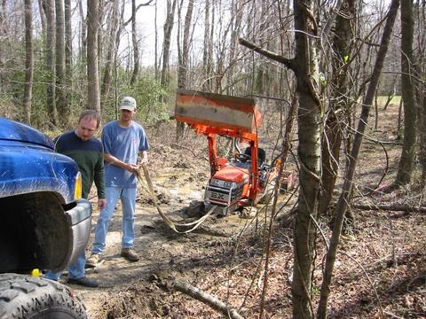 Yeah that was ME /forums/images/graemlins/blush.gif Now I have a bigger tractor and a bigger truck. I stole a 2003 Dodge 4dr Cummins diesel /forums/images/graemlins/grin.gif Now I don't have an excuse to why I can't tow my tractor. Here is a picture of my stock 98 Jeep Cherokee coming down a trail in the George Washington Nat'l Forest. Made it the whole day without getting stuck (took 4 10k # come-a-longs to keep me right side up on the mountain) /forums/images/graemlins/grin.gif