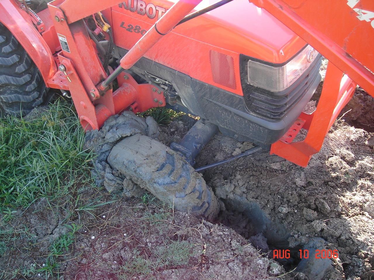Tried putting boards under the tires and FEL with no luck. Went and got my jeep - again no luck. Went and got the F-250 and no luck. Finally got my wife in the F-250 and me on the tractor and got it out.