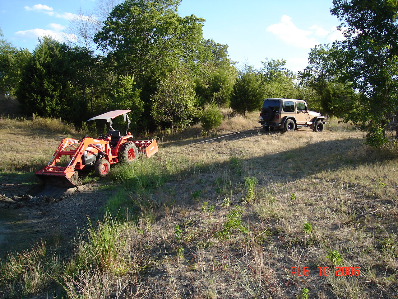 I went and fetched my jeep and all the attchments...chain, draw bar, reciever with clevis and hooked up the the draw bar on the tractor then I jumped in the jeep put her in 4 low let the clutch out pulled the slack out then jumped out of the jeep (yes nobody was drivin) then jumped on the tractor fired her up and with the help of the jeep pullin she pulled right on out, I set the tractor brake then jumped off the tractor then back in the jeep which was still pointed and pullin/digging...well not much with street tires:)then disconnected everything and proceded to do what I had origionally set out to do with out getting stuck this time.