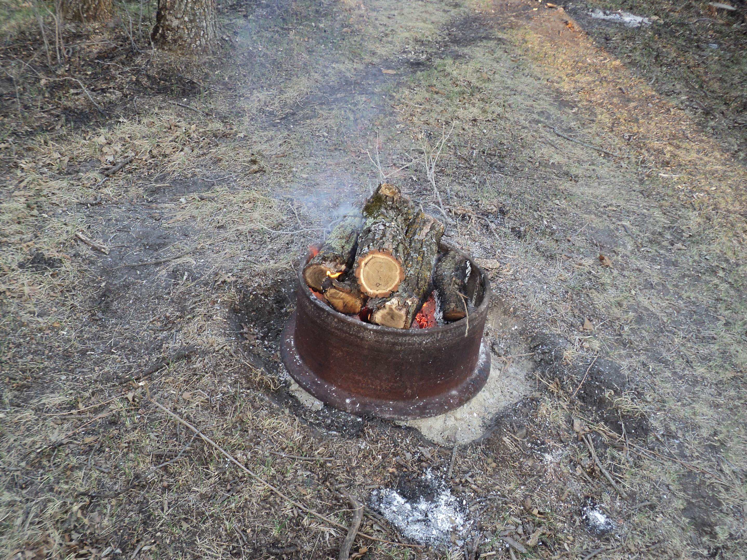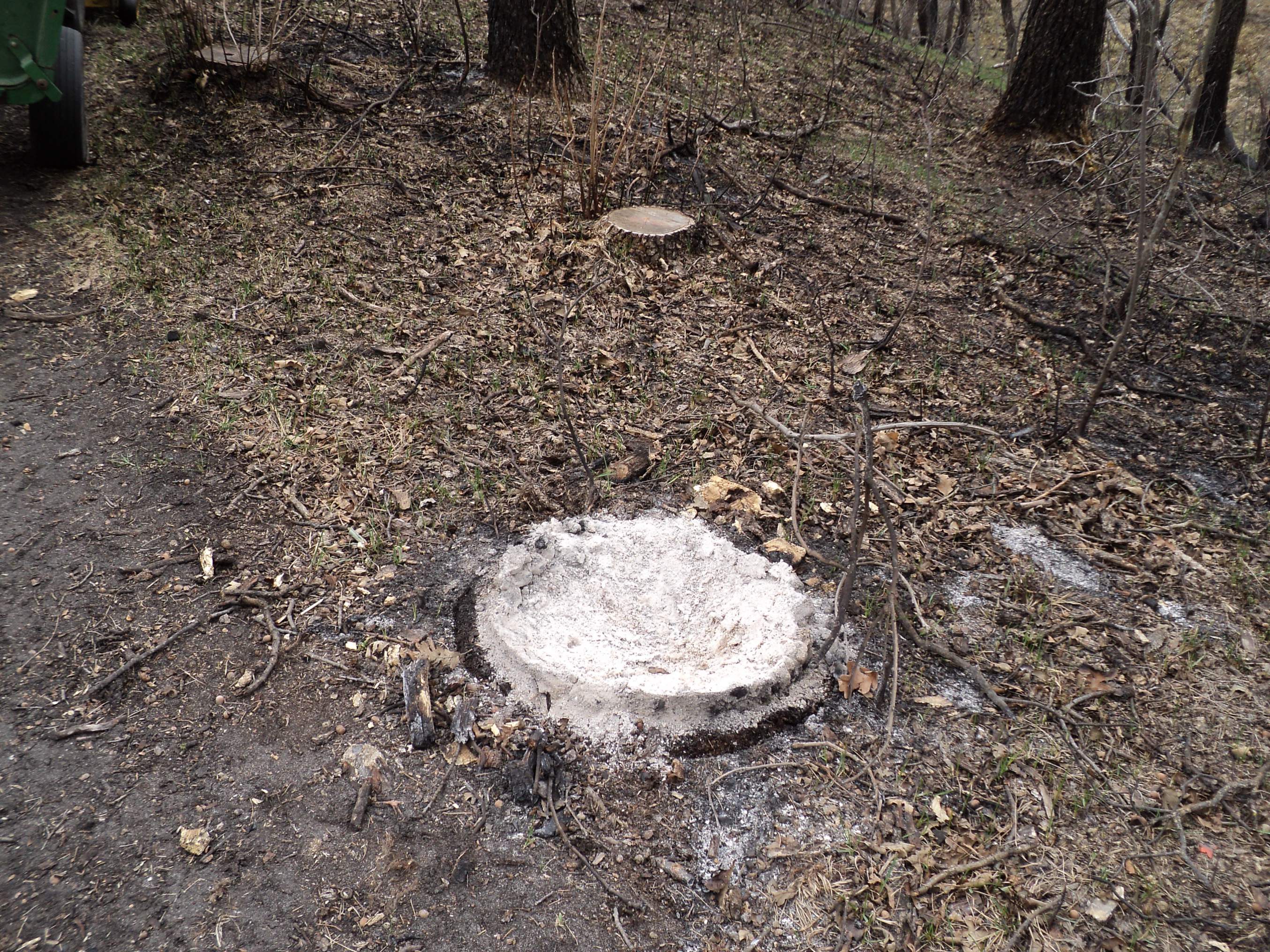Here is my "stump grinder". A Dayton rim with 10# of charcoal placed over the stump., after I drill holes in it with a cordless drill and dump diesel on it.