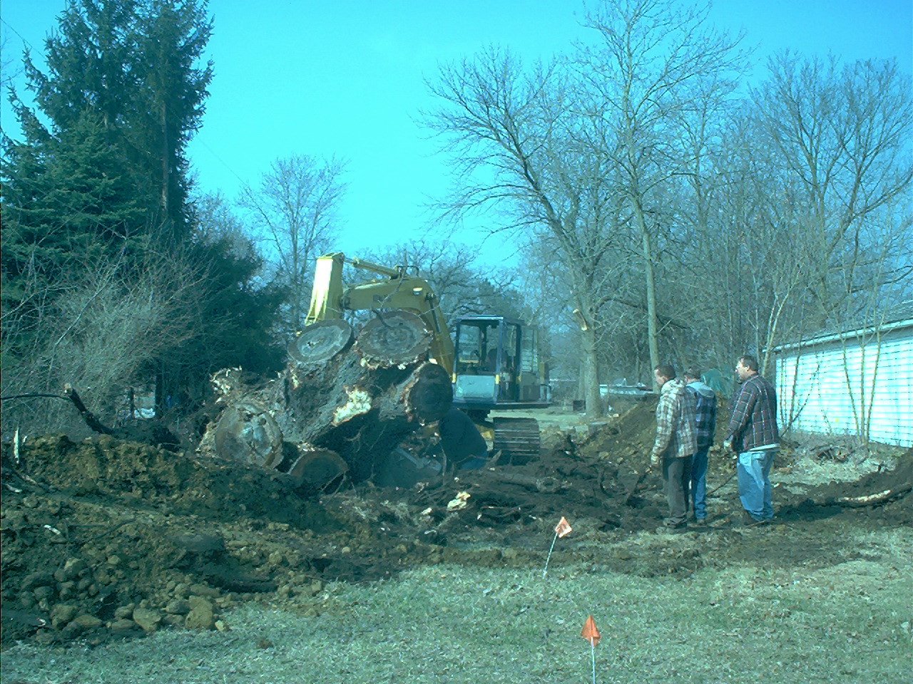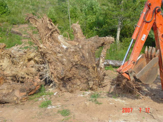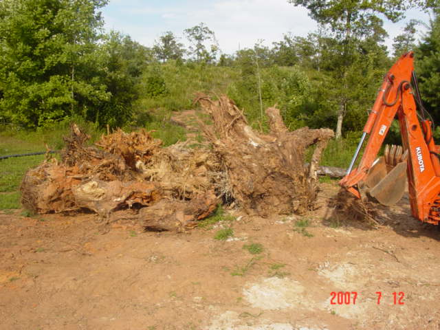 This one took a couple days, 6 1/2 foot backhoe, sawzall, 7 sawzall blades, (12" pruning blades) an 8 ton bottlejack, 3 ton come-along, 5 foot prybar, 3 quarts of sweat (estimated).No way can I get a shovel of dirt without hitting at least one big ole rock, the roots had many big uns trapped ...............................................................