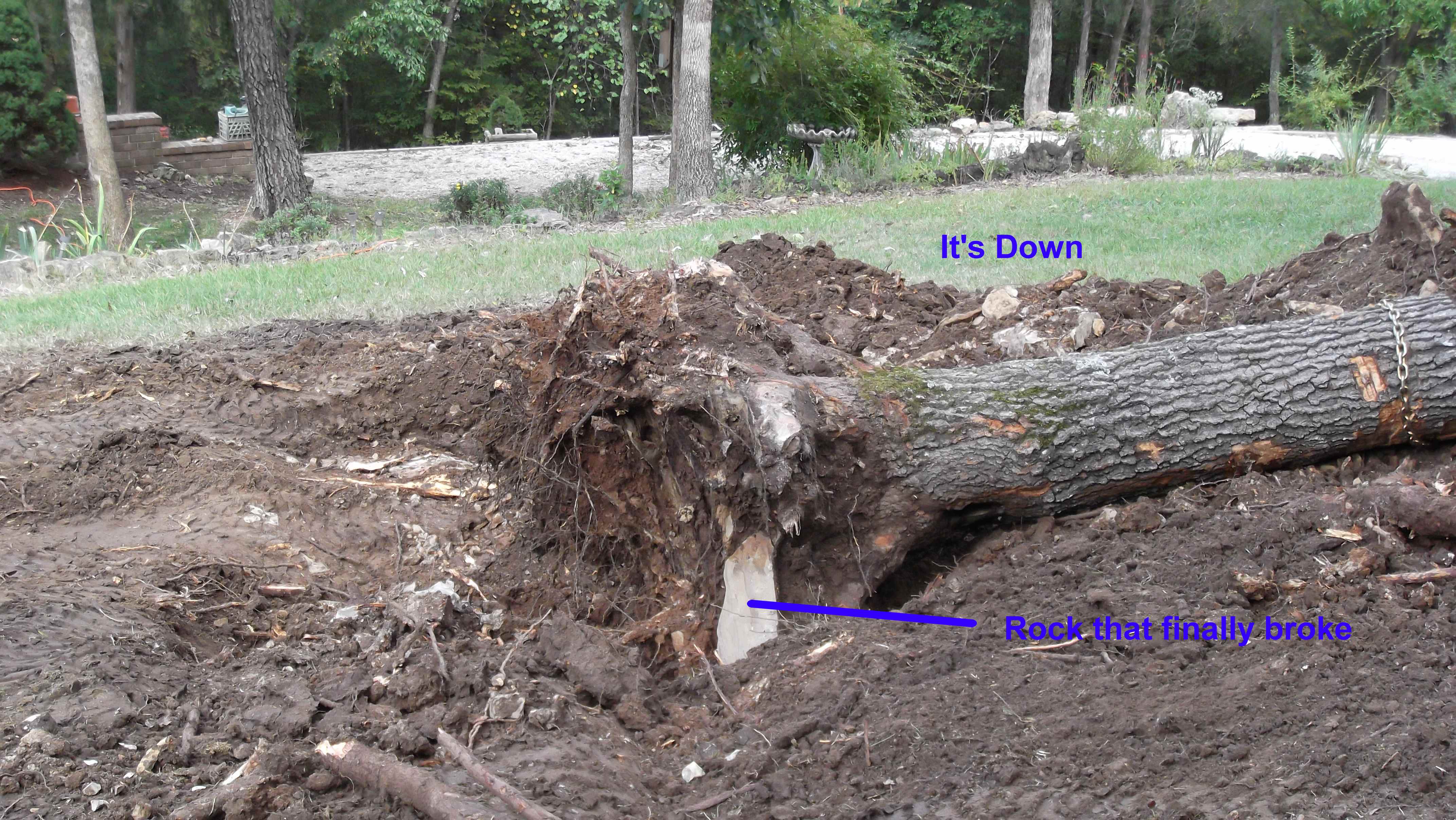Yeah I didn't want to get "skunked" again, so I stayed at it. By the way the little shovel was invaluable for cleaning off the the embedded rocks in the root-ball, it made short work of that chore. I am going to have to invest in a bigger/better chainsaw than my little 14 inch Mac. I had to cut half way through on one side and then cut from the other side. Of course the little saw is just a "limbing" saw.