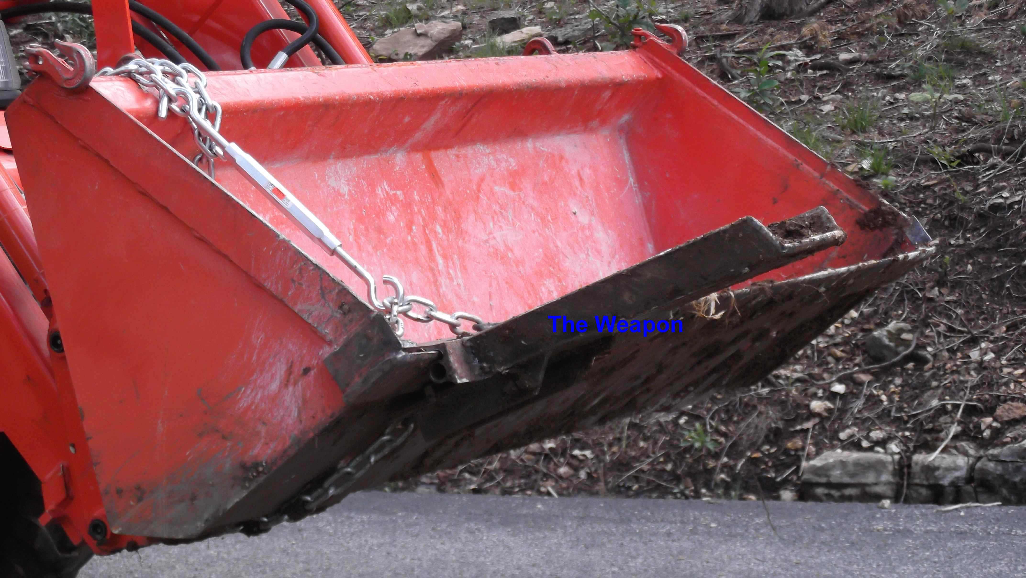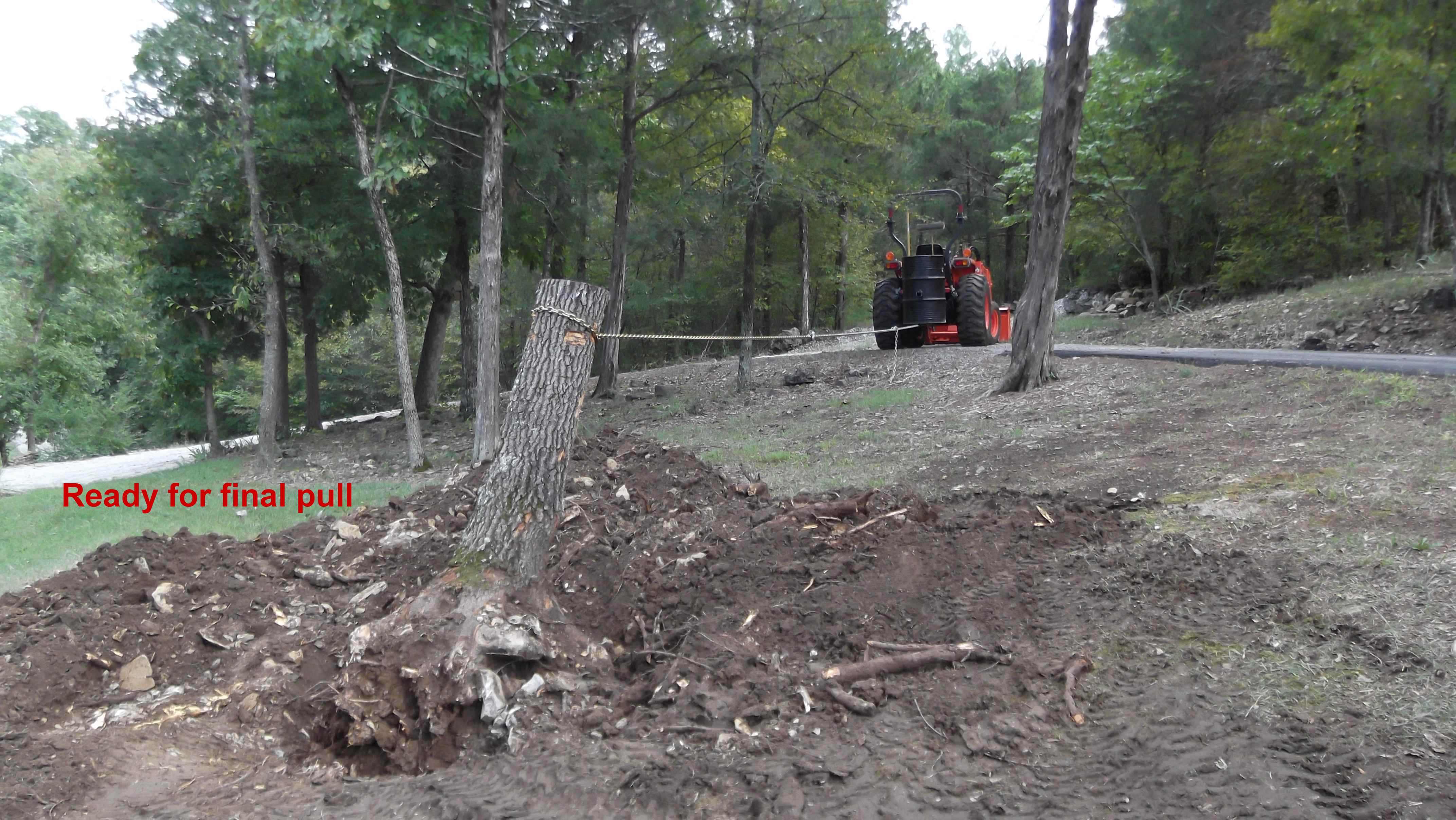 Ok, results were a little different today, I did try jinmans idea of the Carbide drill bit, and I did sever all of the visible roots. (but there were plenty more that were not visible.) I tried to pull again after all the visible roots were cut, and it never budged. So put the home-made bucket shovel back on, and had at it digging for a least 2 or 3 hours non-stop. I kept on digging and popping out roots and rocks so deep the shovel was buried, and the Regular FEL bucket was digging up dirt several inches deep too as I run out of reach on the 18 inch shovel. (bet a shovel for forks would be better as you would not have that problem). Anyway after digging to China, I tried the pull going East again, it never budged. So I move the tractor and went South, This time the huge rock on the West side popped and actually split the rock, The stump started to lean, So I grabbed the camera and the Wife, and the rest is history. I could not have done without my little bucket shovel, It would have defeated me again, but it is just a memory now:thumbsup: