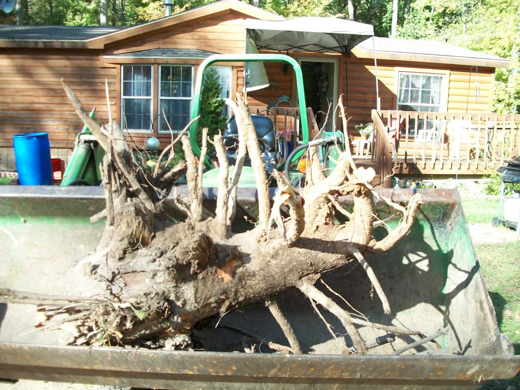 Hitched on to one root section, started forward, and with a wrench!< out it comes. Hook on to another, out it comes too. One of the root sections is over 6 ft long from butt till where it broke from the ground.