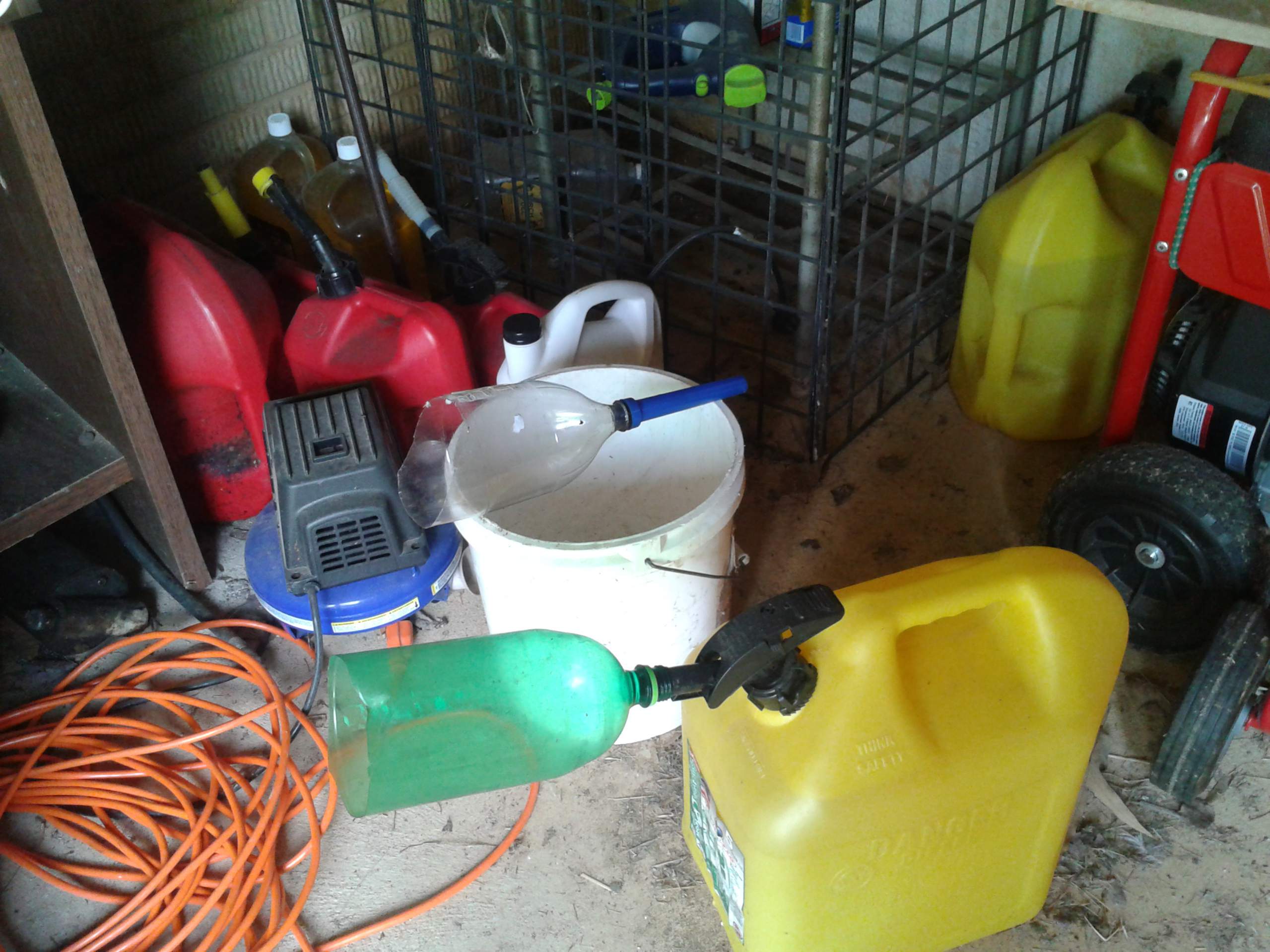 All of my home-made solutions are below... My Diet Mtn Dew Diesel funnel is in both pics (note the ROUND TOP). I also cut the top ring off a 5 gallon bucket touse at my Kioti Oil Change Bucket, and I cut a Diet Coke bottle at an angle and added an extension I had for my oil filler funnel. (I made these recently when I finally did the 50 hour service...).