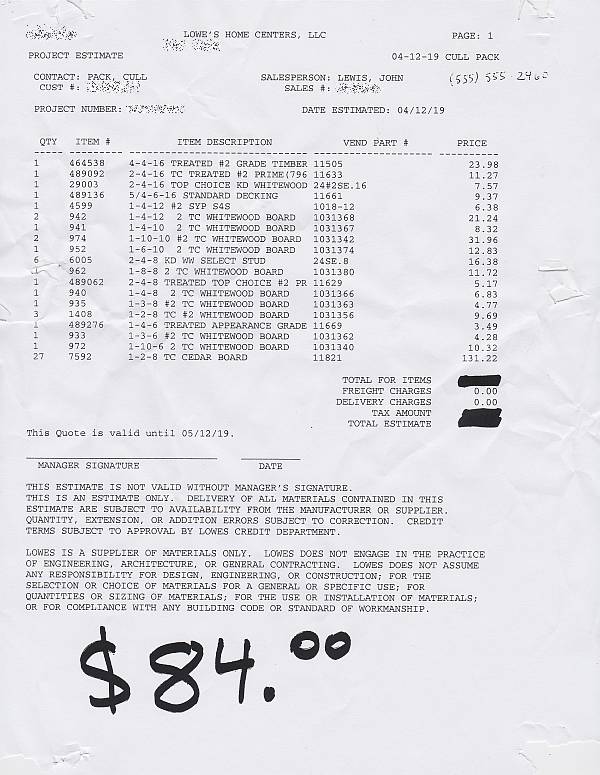 I love these things. I've done a couple before with varied results. Often the boards are twisted or cracked/split, but I can cut enough out to be able to use them fine. This load has a few warped boards, but most don't show any problems at all. The Cedar 1x2s are clean as can be, so maybe just a discontinued item. I totaled up the line items amounts and it comes to around $330.
