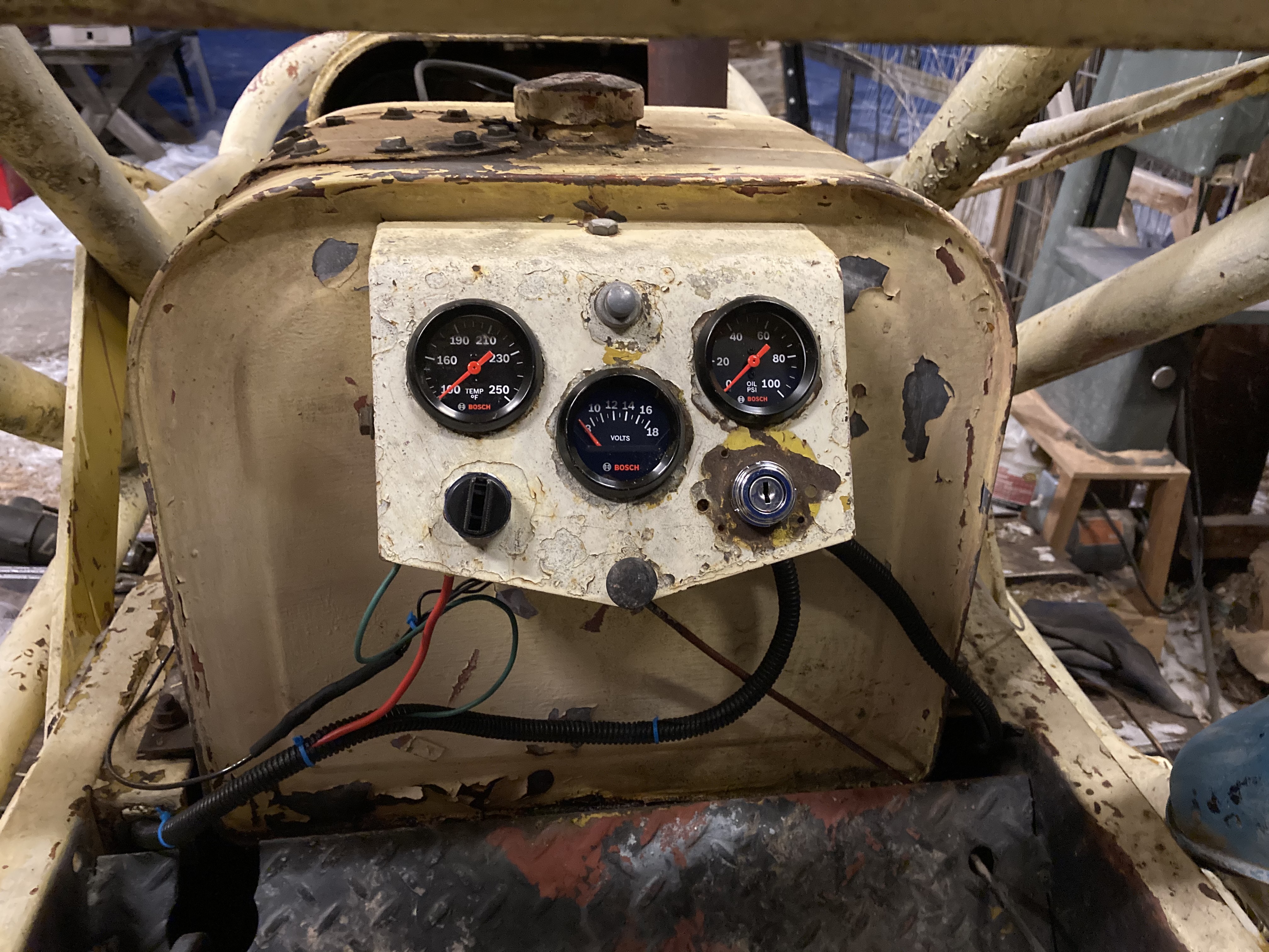 Thanks to all for the advice and input, and thanks for your patience. I've been vacationing for the holidays, and I'm just now back to sitting at a desk where posting progress updates is easy. When I started searching for 25mm switches I came up with a good selection. I've attached a picture of the dash with new switches and new gauges. You can also see that I ran all the new stuff in plastic looms.