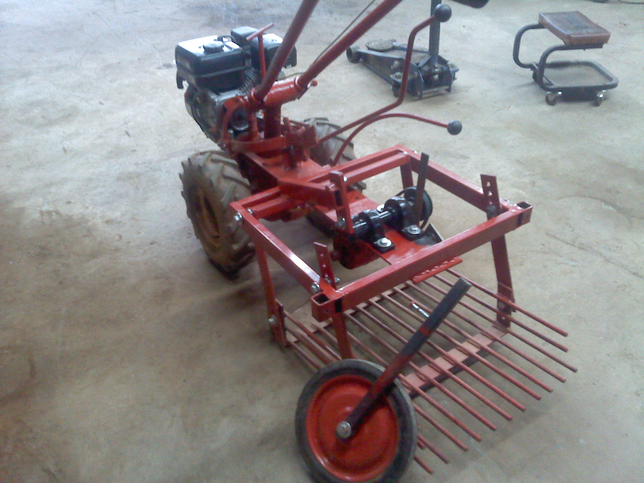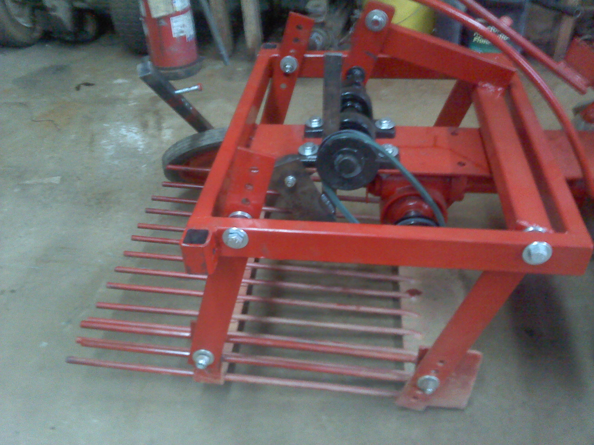 I had seen the other video before, but it was after I started building mine. I think instead of building steel paddle tires, I am just going to add dual wheels to mine. I have another set of tires and making and adapter for mounting will probably be a lot easier than making paddle wheels. One other thing I think I might or mightnot of done wrong is in the width of my digger. I sort of figured that since the tiller part of the original design was 22in wide, then the digger would work at that width. It might be a little wide for my light setup. Since i was more concerned with lifting rocks than I was potato's, when I started this project I wanted as wide as possible. For tater digging, you are just trying to get under the tater rows. My biggest problem now is finding time to finish and test. Its either raining or I'm working. I have changed pulley ratios and sped up the digging action by double. works pretty wicked in the shop, I just need to find dirt and not mud to put it in.