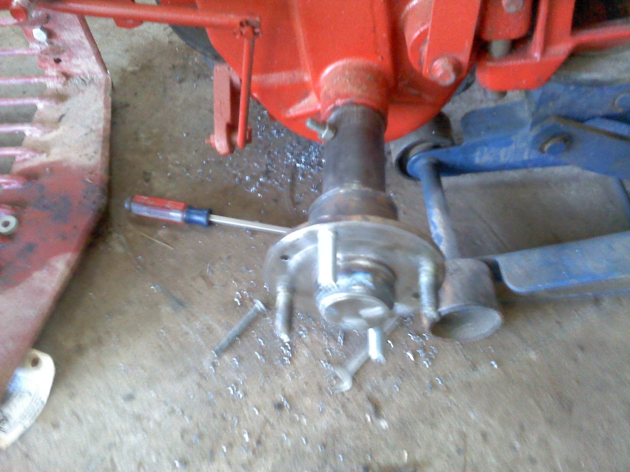 Got back to the digger build this wk. I had some old Steiner tractor tires laying around not being used, Just had to figure out how to mount them. The axle shaft out of the troybuilt tiller is 1in, the Stiener uses 4lug hubs. these hubs just happen to have the same bolt pattern as a couple of old hubs I had on the shelf. I took a piece of 1 7/8 shaft material, bored the center to 1 india to fit over the troybuilt axle shafts. I then turned the outside dia down to fit inside the 4lug hubs. A little welding, trueup the flange face on the lathe, and I now have big tires on the troybuilt.
