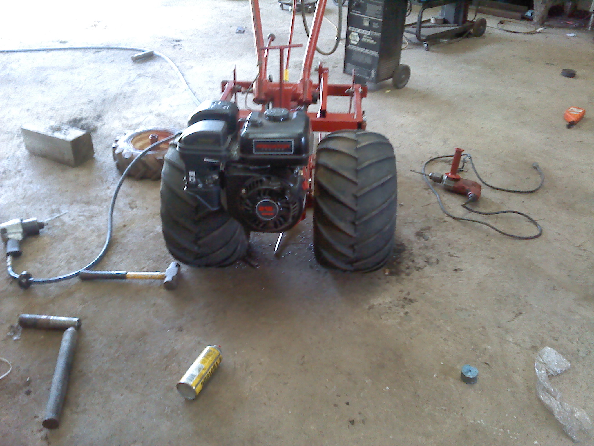 UPS delivered my new pully's late yesterday so i didnt get around to putting them on. I will be doing so today. I also think my machine is going to be to lite to work properly, but I have some weights I will add to see if that helps. I am also looking for some bigger tires to see if that will help. Could run into more problems adding weights and tires in that I dont know how well the troybilt tiller gears will hold up to all that extra stress. Rain all day yesterday, and more rain called for today, so dont know if I will get to try it.
