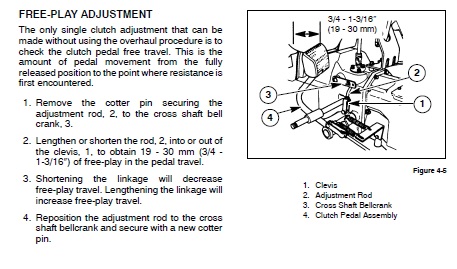My clutch has no free play nearly at all at the clutch pedal. About 3/10 times when I'm completely stopped, and putting the tractor in gear (w/ the FEL off the ground, parking brake off, etc), it grinds a bit. Sometimes it grinds more than others. I want to adjust the clutch pedal free play to see if this helps at all.
