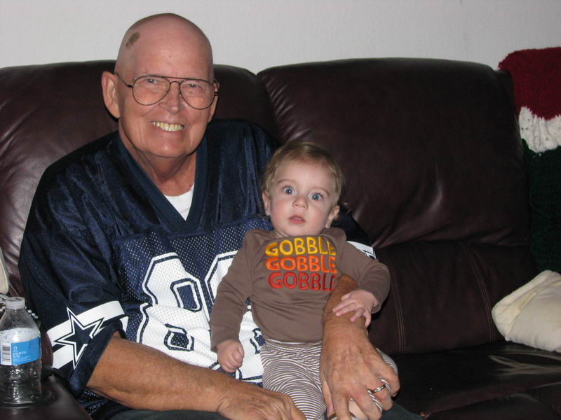 Brandi, your "Pumpkin Doodle" sure has a sweet little smile and a chubby little face with a mop of hair.:) She looks to be 15-17 lb, maybe more. My grandson is a little over 17 lb and sitting up by himself. He's already trying to crawl, just hasn't got all his limbs working together yet.:D Of course, I can't let you get ahead of me in the picture count, so I'll just have to post three pictures of my own of my great-grandson, Noah.;) BTW: That's my granddaughter in the 2nd photo. I wish we had her mother in the photo so we'd have 4 generations. Oh well, maybe when my hair grows back they'll pose with me again.:)