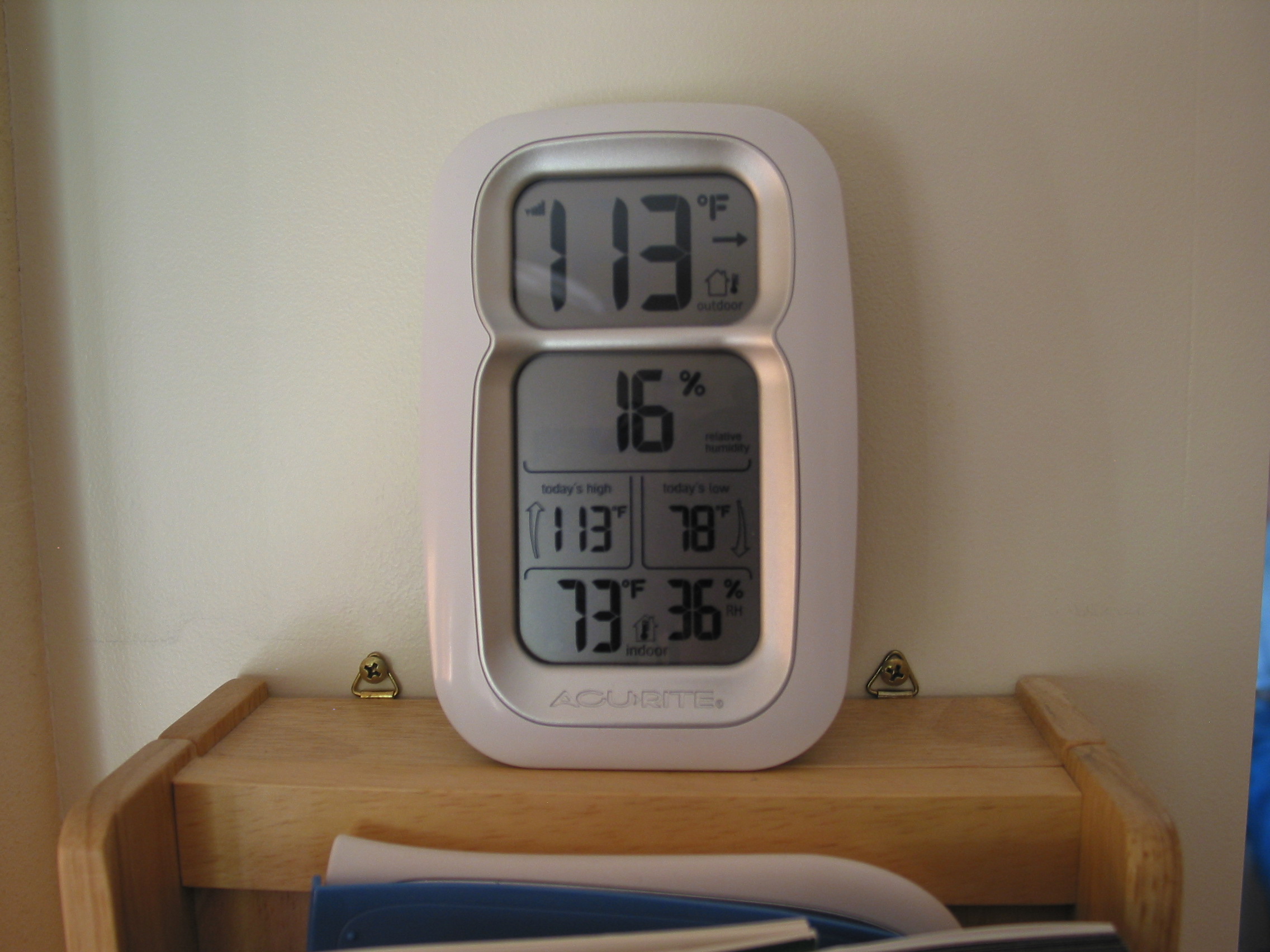 With the cloud cover and cool breeze, I thought we'd likely not make 100 today. Now it's clear and the sun's out. It's 96.5 at 1 pm and it will easily make 100. :(
