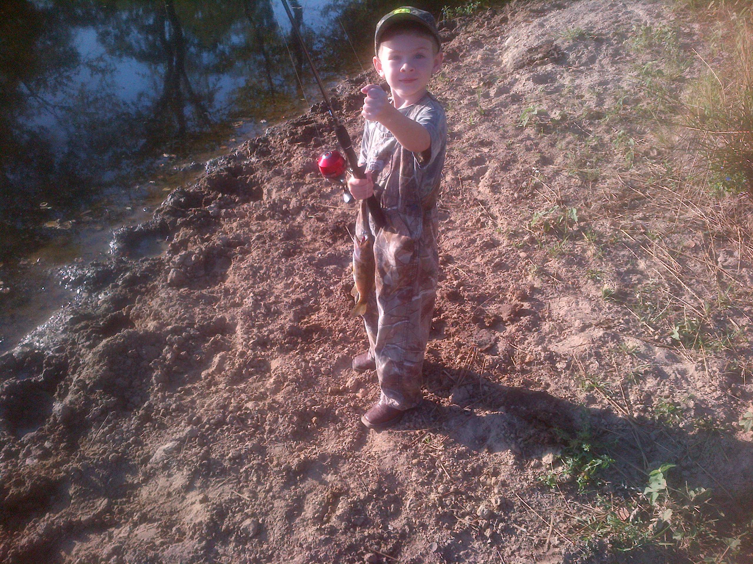 That little fellow sure is cute. Too bad he isn't holdin' a fish.;) Foreman, your pond sure looks clean and moss free. That makes fishing (or feeding them bait) mighty nice.