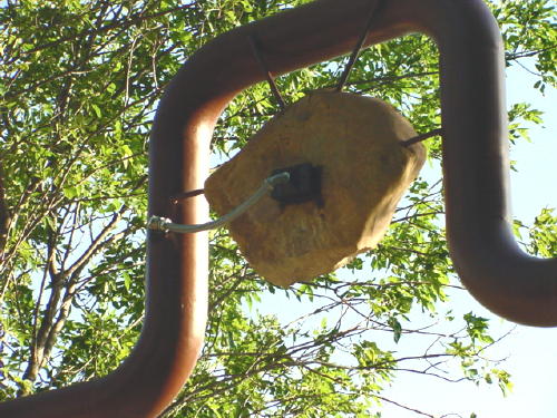 The hole in the bottom is for the camera. It, the hole, is two and half inches across and three inches deep. The camera is two inches in diameter and two and a half inches deep. In the back of the rock a rectangle is cut out for a weathertite electrical box. And there's a five eighths hole between them.