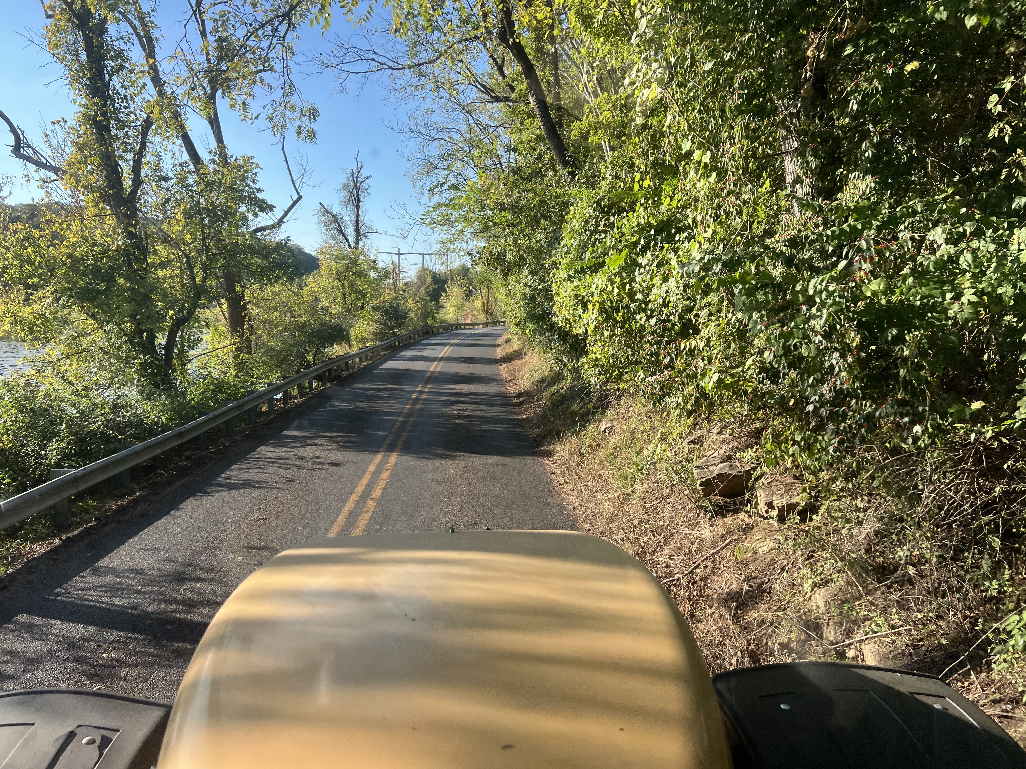 Below: Absolutely NO place to go here. Guardrail on the other lane and ZERO road shoulder. I’m over the yellow lines a bit. Worst is when you get a woman driving a school bus coming at ya.