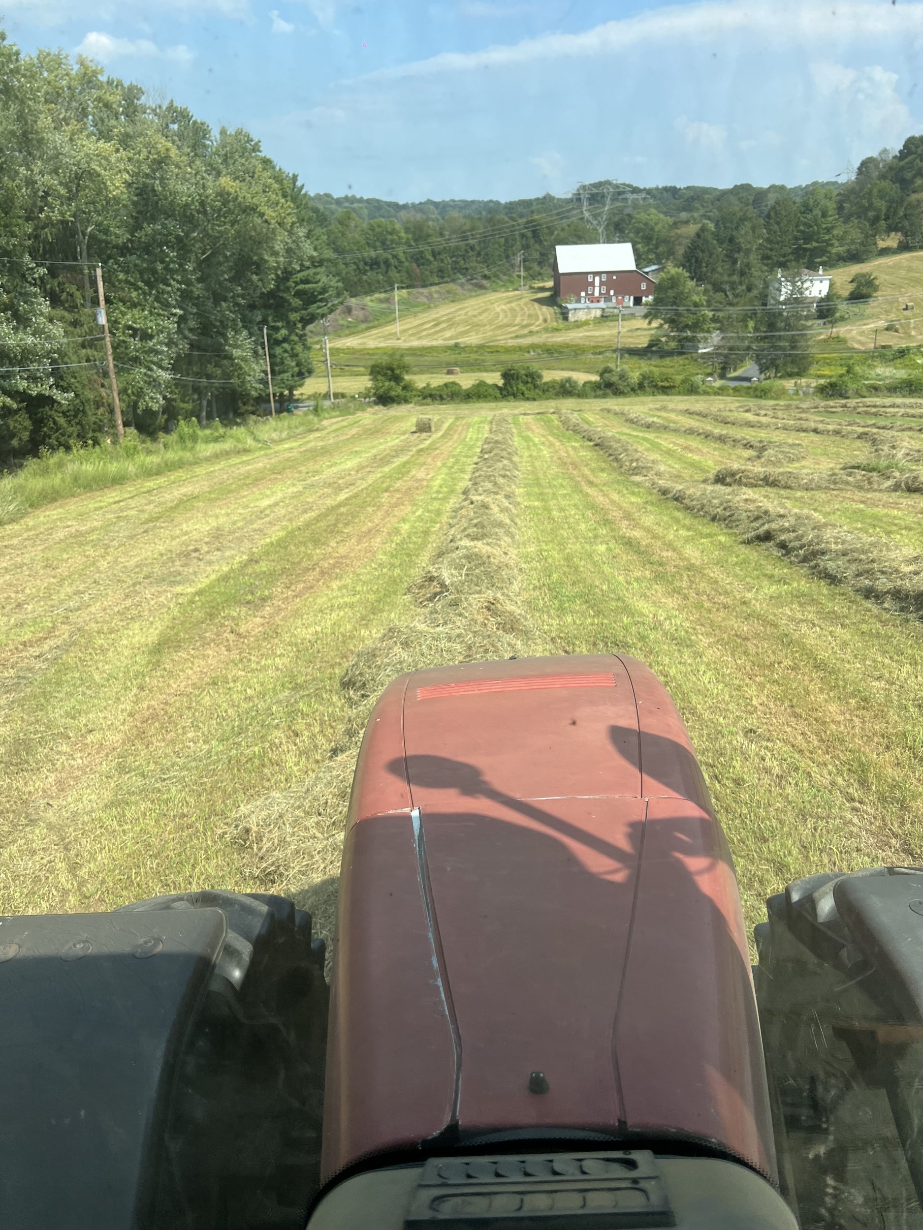 Today was another good day, but got cut short by some heavy, short downpours at about 5PM. Today I baled the hill across the road from historic Ring Farm. Very steep ground. It was grazed by Brown Swiss for about 100 years, or baled with loose hay way back, then small squares until about 2012 when I got there. Definitely a challenge with the large square baler.