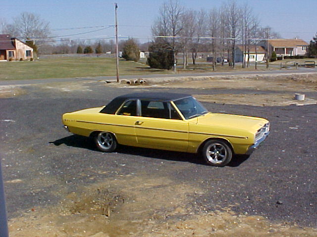 Ken, that's a '68 2dr sedan (LL21). Originally 273 V8, 904 auto trans, 2.71:1 7¼" rear A/C, PS, variable speed (not 2-speed, not 3-speed) wipers, all tinted windows, up-grade interior, yellow W/black PAINTED roof & gold vinyl bench seat interior car. It's now painted 1970 Y-1 (Top Banana) yellow W/black vinyl top, mostly black cloth interior (still bench seat), has a mild (about 350 HP) 360, A-518 (4-spd AOD) trans, 3.91:1 8¾" narrowed C-body station wagon rear, NOS firm feel police PS box, C-body (Newport, New Yorker) pitman/idler arms & tie rod ends (arms are 2" longer for faster steering, tie rods are bigger, 11/16" vs 9/16"), 1.04" torsion bars, slightly relocated HD leaf springs (moved inboard ¾" each), Koni shocks, 1¼" anti roll bar, 10.875" (soon to be 11¾") disc brakes & 10" drums both running carbon metallic frictions, hand made tri-Y headers (to clear the steering mods), hand made welded frame connectors, & ½" full recirculating fuel system feeding the Holley 650 double pumper. It rides on 16" X 7" Torque Thrust II wheels with BFG KDW tires (205/55's on front, 245/50's on back). It's not