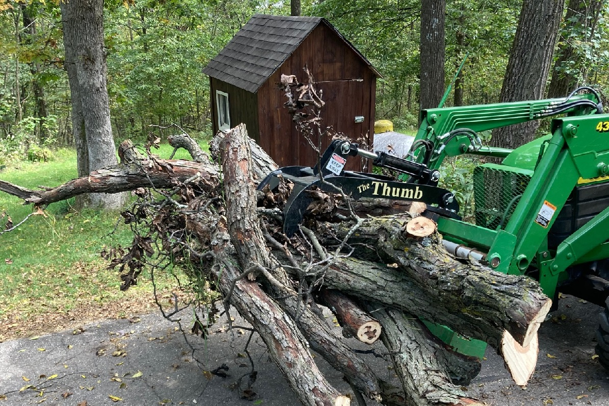 The most frequent use will be lifting logs off a pile and setting them on the ground for bucking, in which case I think I can control the descent by how steeply I angle the forks down. The other potential use would be lifting logs out of a trailer, but I'd need shorter forks to get into the trailer more easily, and I'd have to be careful not to catch the far wall of the trailer with the thumb. It's a closed-side trailer with a railing about 2 feet above the floor: