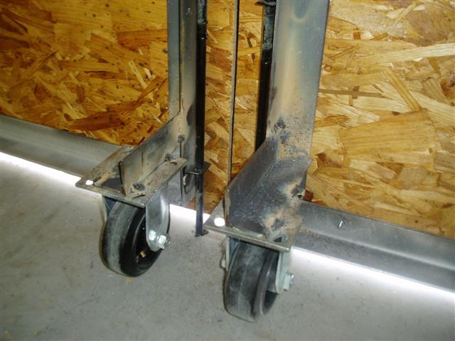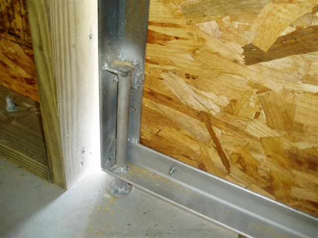 The streetside barn door frame/pin idea that i came up with...(don't look at the welds!....i had to use my 110v unit and they ain't pretty:mad: ) The 7/8 pin is 4" into the concrete resting on a 1/4" nylon washer and the hole is filled with grease. The doors are 6x12' each, framed with 2x2 3/16 angle. I will cross brace them later when my Millermatic 210 has something to plug into(still on temp pole)