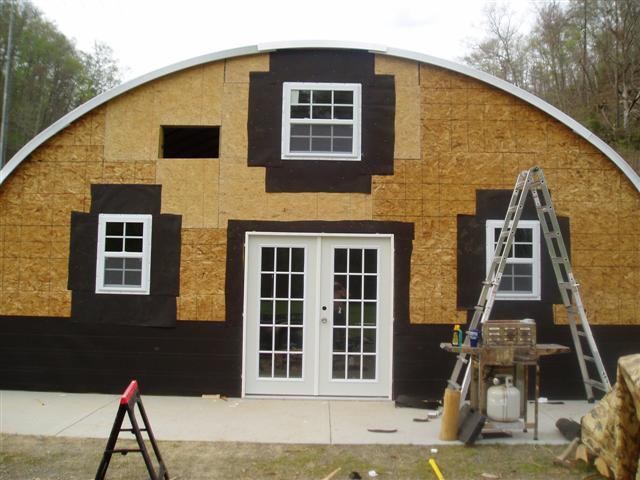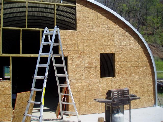 Also, i guess my framing looks a little eclectic...let me explain. I was going to go with board on board-1x8's 16' long, but the guy that was going to mill them(poplar) had a big order come in ahaed of mine, so i would have had to wait too long. While i was looking for another source, i found the 7/16 OSB at HD for $4.98 a sheet, so we decided to OSB it and go with vinyl siding. Anyway it is in.....