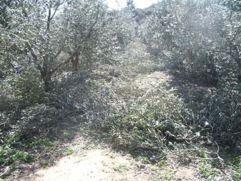 While I have never prunned an olive tree I used to prune alot of apple trees when I was growing up. We would prune all the trees and then go back and pile all the brush in a wind row in the middle of the lane between the trees. We would then take a tractor with forks on the front and push the brush to the ends of the rows into piles and burn.