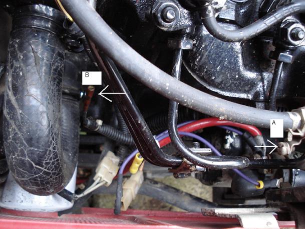 The wire connection tab "A" looks like it is broaken off the thermostarter and black wire & round clear rubber insulated brass connector "B" is missing a wire connection to the thermostarter.